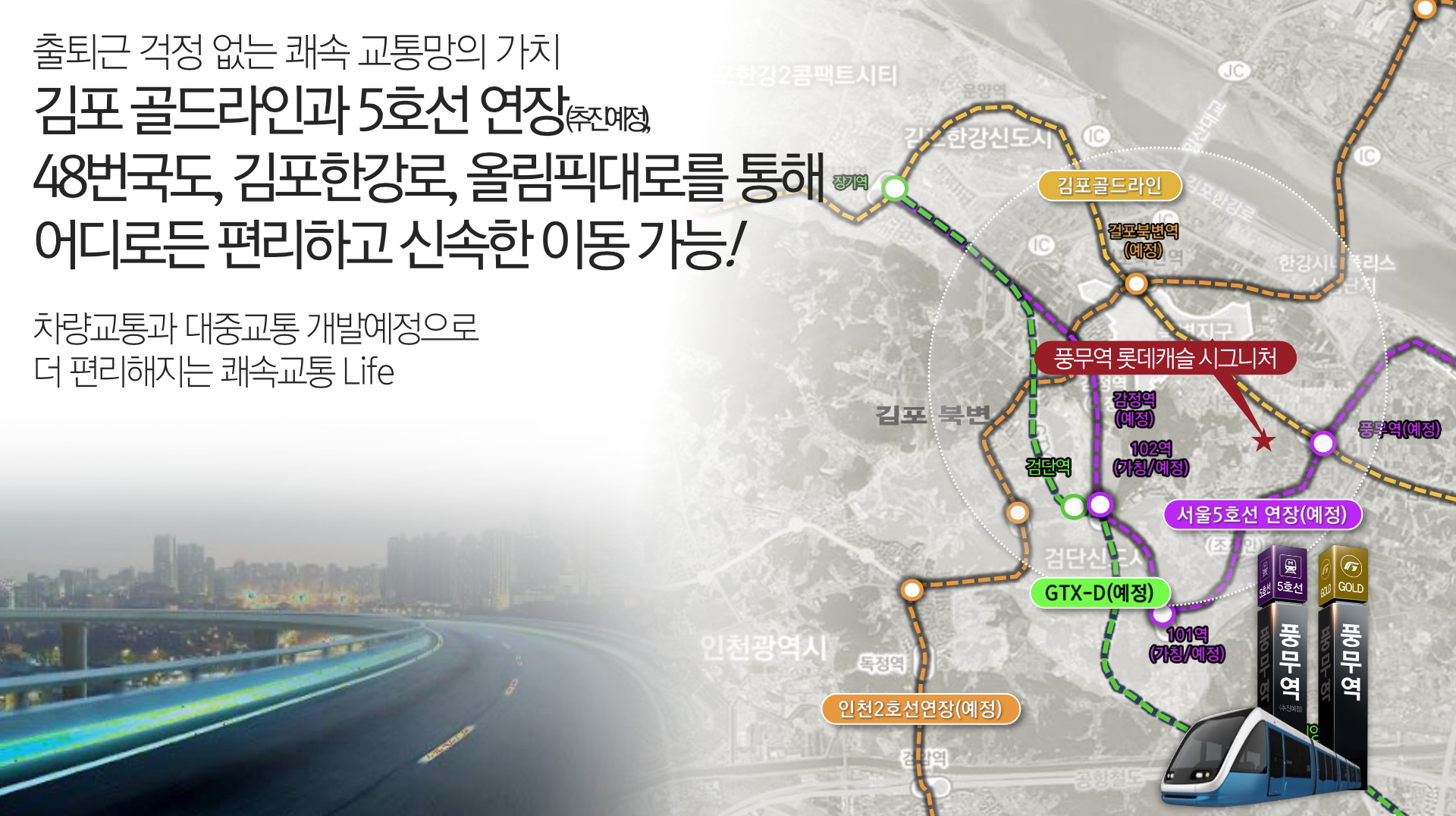 김포골드라인 풍무역이 도보권에 있어 김포공항은 10분대, 서울 마곡지구는 20분대, 여의도는 40분대 진입이 가능합니다. 또한 인천 검단·계양 생활권과 인접해 있어 더블 생활권 입지로 평가됩니다. 서울지하철 5호선 연장과 GTX-D 추진 호재도 맞물려 교통 프리미엄은 더욱 강화될 전망입니다.