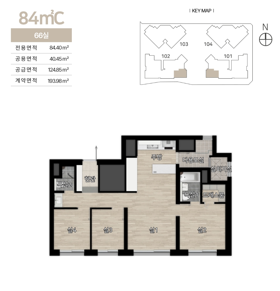 전용 84㎡ 단일 평면으로 4베이 판상형 구조가 적용돼 채광과 통풍을 극대화합니다. 거실과 주방은 넓고 실용적으로 설계됐으며, 드레스룸과 팬트리 등 수납공간도 충분히 확보되어 있습니다.