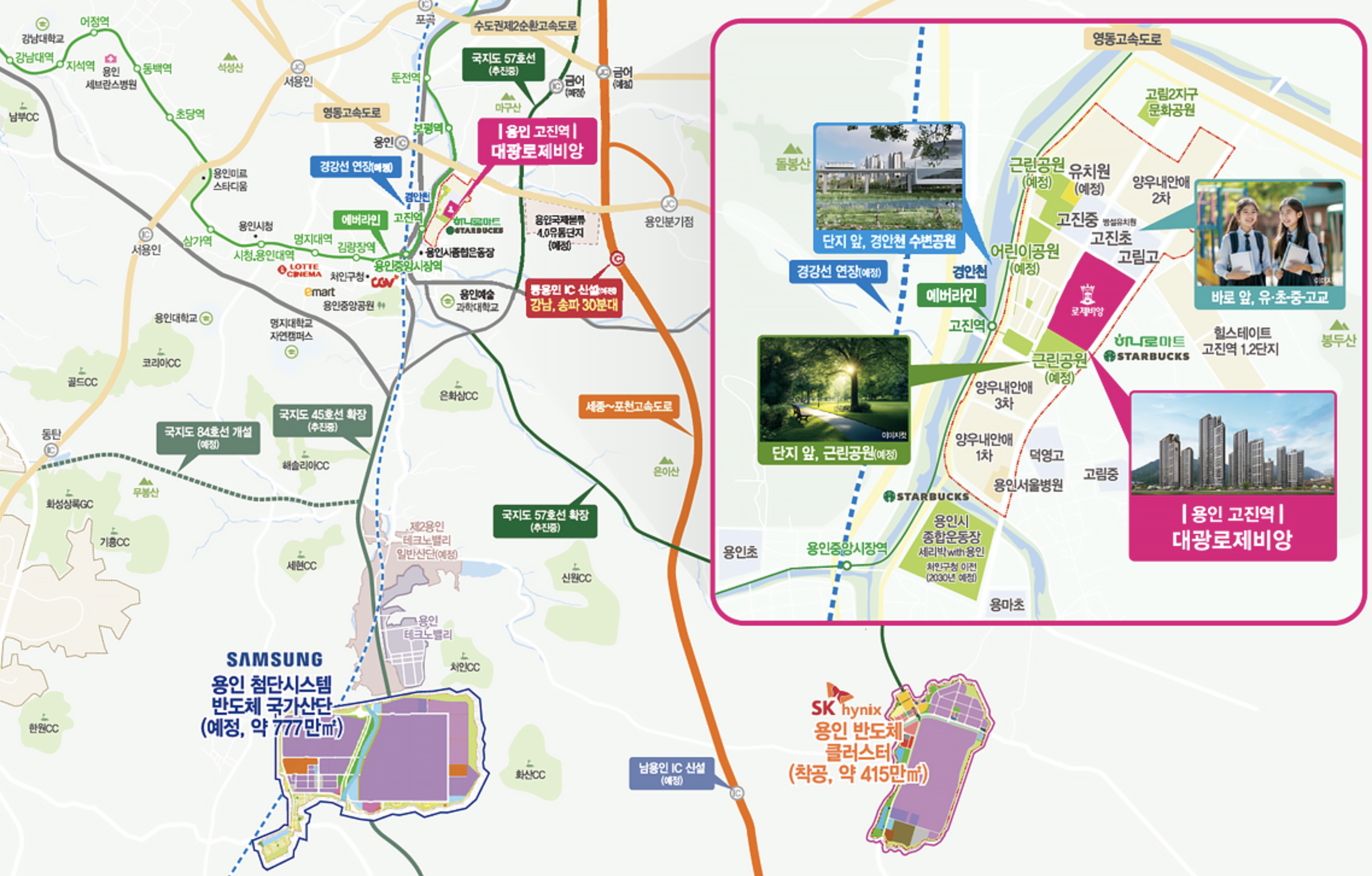 단지 바로 앞 에버라인 고진역이 도보 2분 거리에 있어 지하철 이용이 편리합니다. 경강선 연장 예정 노선에 포함된 용인중앙시장역도 한 정거장 거리에 위치해 향후 광역 교통망 확충의 직접적인 수혜를 누릴 수 있습니다. 차량 이용 시 용인IC를 통한 수도권 제2순환고속도로와 영동고속도로 진입이 수월하며, 서울 강남·송파까지 약 30분대 접근이 가능합니다. 향후 동용인IC 개통으로 세종-포천고속도로와의 연결도 예정돼 있어 교통환경은 더욱 향상될 전망입니다.