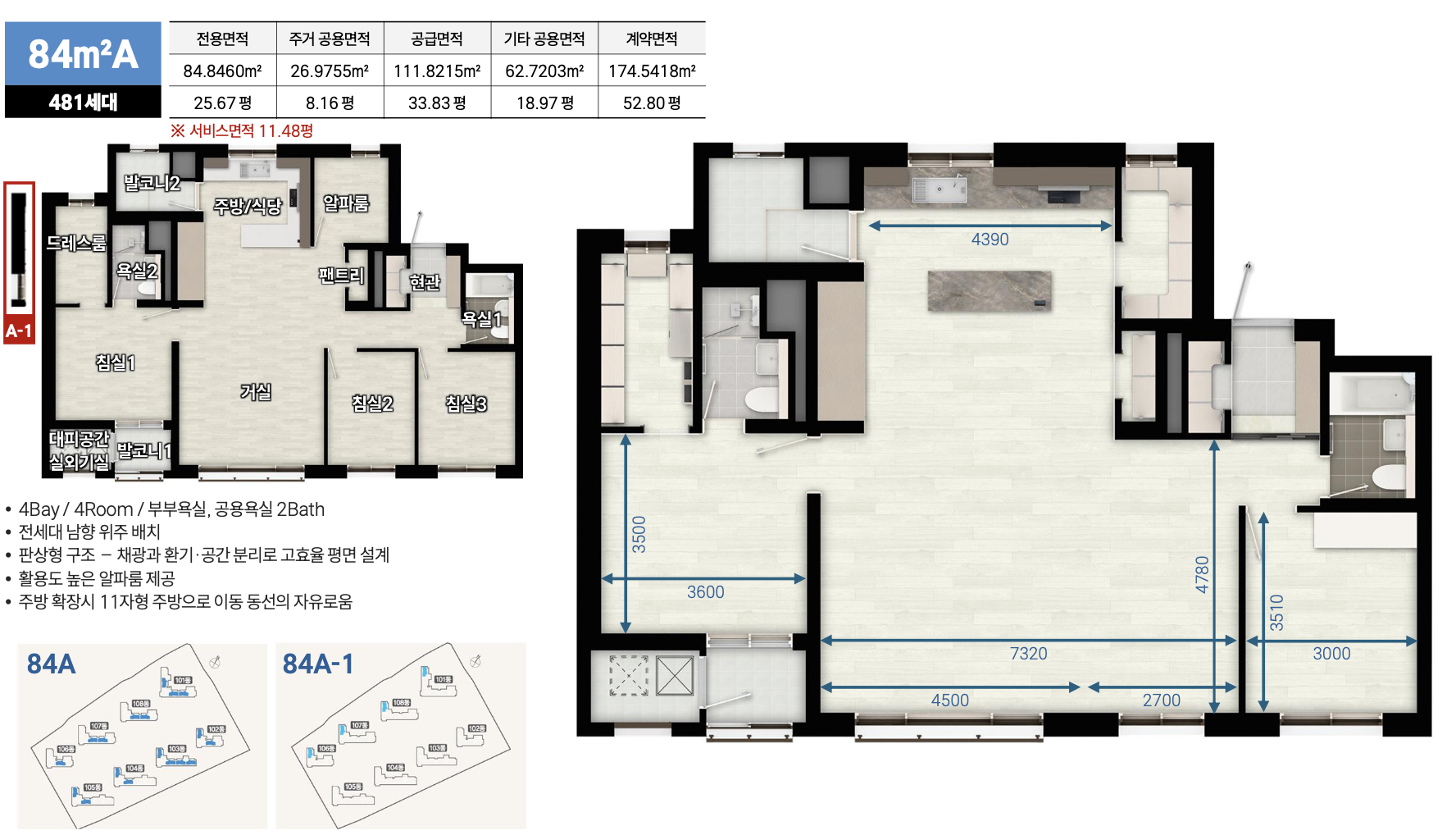 남향 위주의 단지 배치와 4베이 설계가 적용되어 채광과 통풍이 극대화됩니다. 세대별로 알파룸, 팬트리, 드레스룸, 발코니 등이 제공되어 생활 편의성이 강화됩니다. 최대 119m의 동간 거리를 확보해 일조권과 프라이버시도 보장됩니다.