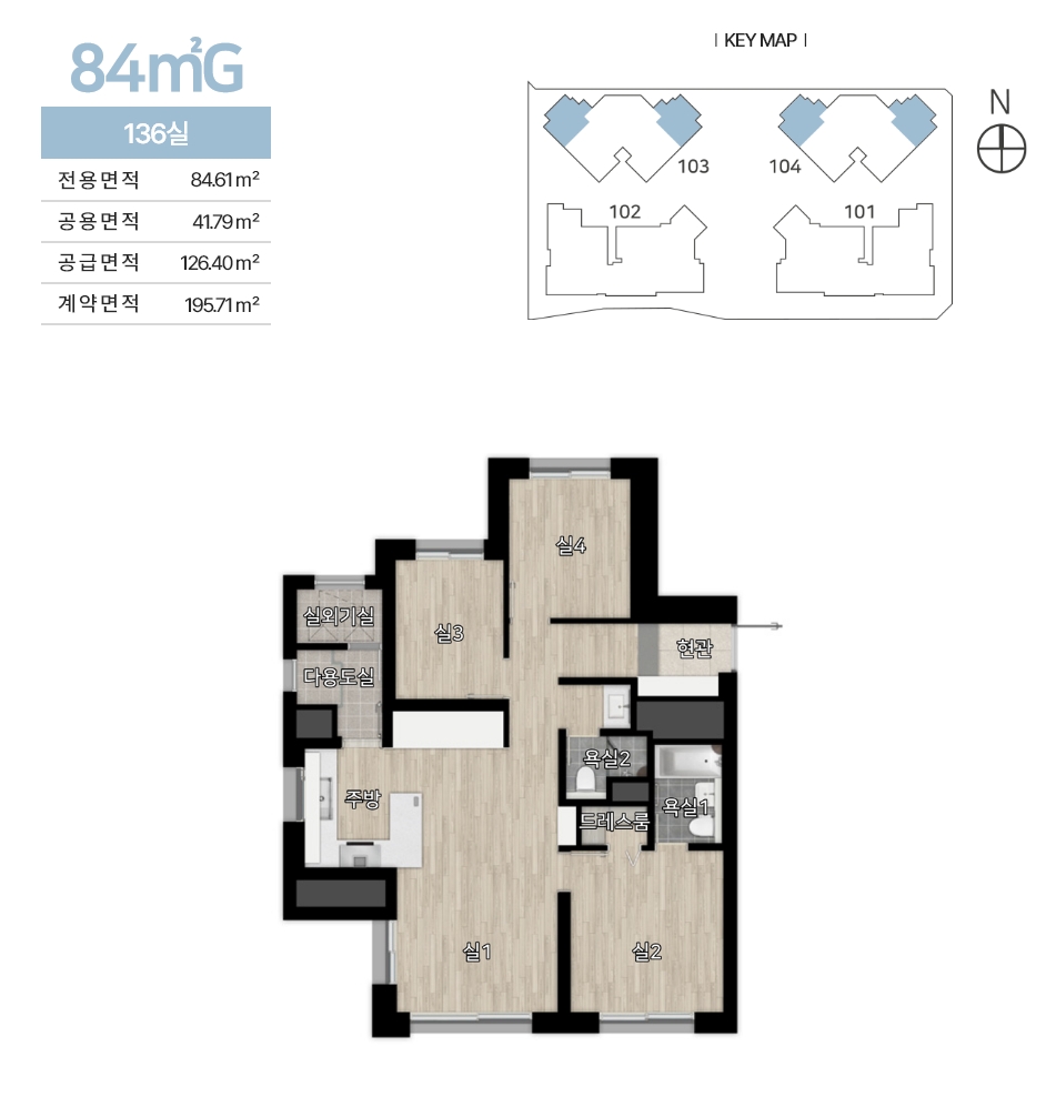 전용 84㎡ 단일 평면으로 4베이 판상형 구조가 적용돼 채광과 통풍을 극대화합니다. 거실과 주방은 넓고 실용적으로 설계됐으며, 드레스룸과 팬트리 등 수납공간도 충분히 확보되어 있습니다.