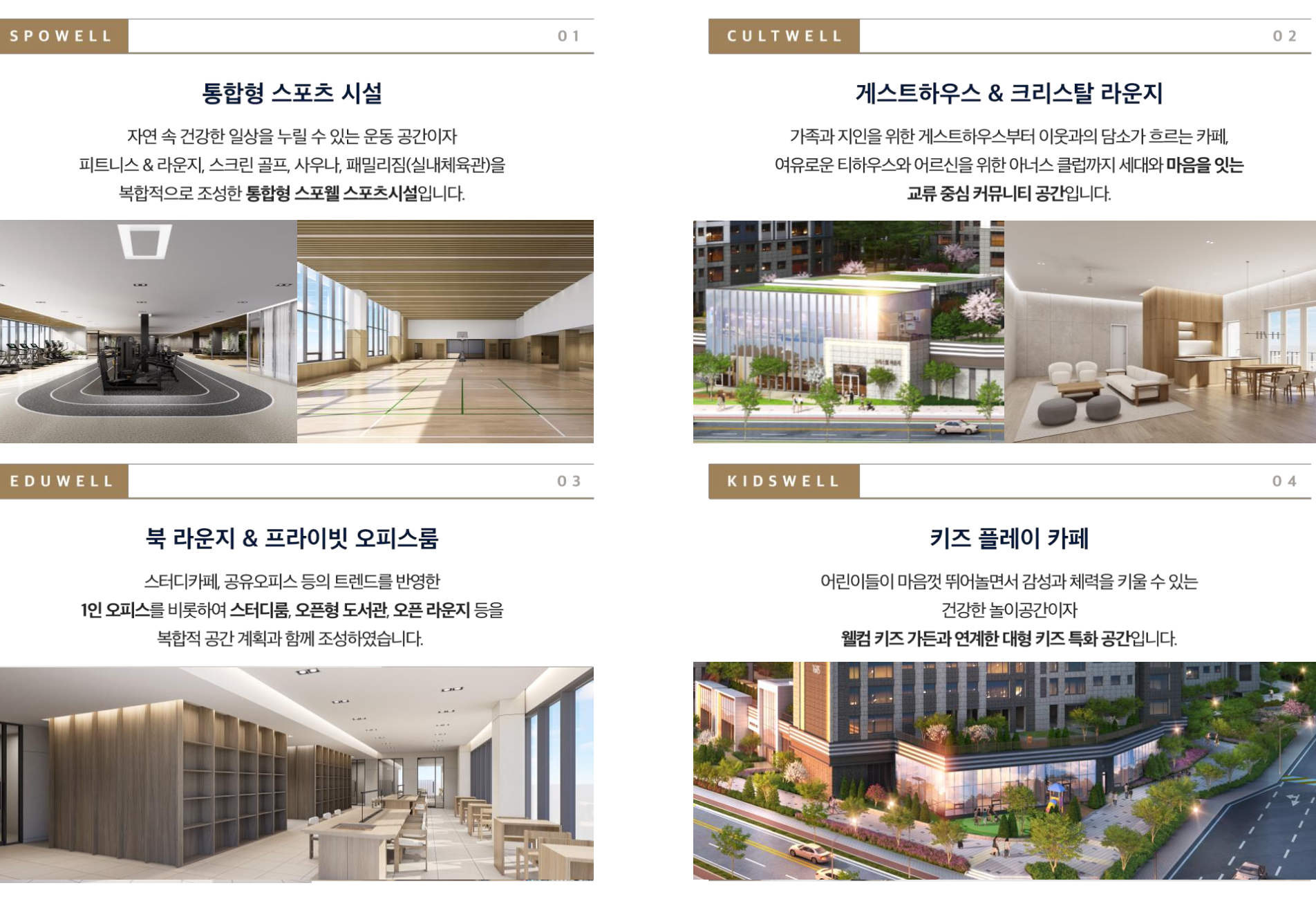 단지는 ‘센트웰 프레스티지 커뮤니티’를 중심으로 고급형 복합시설을 갖추고 있습니다. 스포웰, 컬트웰, 에듀웰, 키즈웰 등 4개 존으로 구성되어 피트니스, 사우나, 골프라운지, 북라운지, 게스트하우스 등 다양한 여가공간이 마련되었습니다. 전 연령층이 만족할 수 있는 커뮤니티 환경으로 단지의 품격을 한층 더 높였습니다.