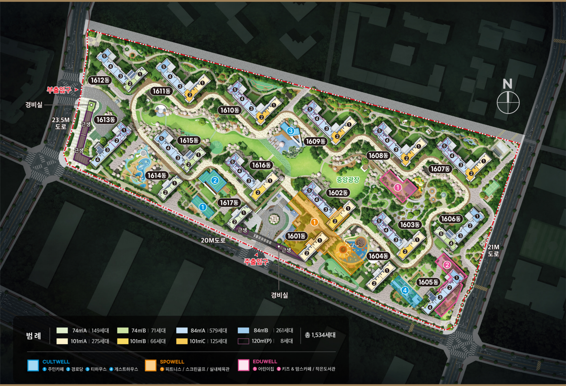 입주민을 위한 ‘센트웰 프레스티지 커뮤니티’가 조성되어 있습니다. 스포웰·컬트웰·에듀웰·키즈웰 네 개 존으로 구성되어, 피트니스센터, 사우나, 골프라운지, 북라운지, 게스트하우스, 키즈 플레이 클럽 등 다양한 시설을 제공합니다. 특히 크리스탈 라운지와 가든 스위트는 리조트 감성을 담은 여가 공간으로, 입주민 만족도를 높입니다.