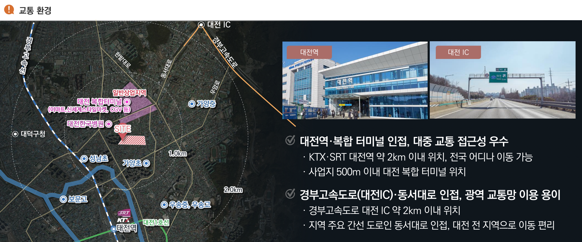 KTX와 SRT를 모두 이용할 수 있는 대전역이 인근에 위치해 전국 주요 도시로의 접근이 뛰어납니다. 대전 지하철 1호선과 트램 2호선(예정)을 모두 이용할 수 있는 교통 요지이며, 차량 이용 시 우암로와 동서대로, 경부고속도로 대전IC 접근도 수월합니다. 철도와 도로 교통이 결합된 입지로 도심 전역 이동이 편리합니다.