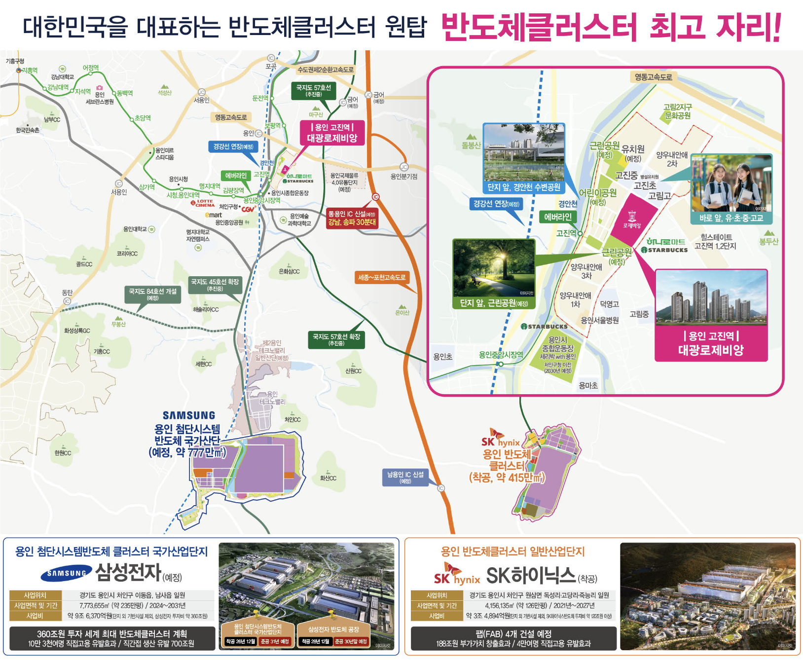 에버라인 고진역이 도보 2분 거리에 위치해 있으며, 경강선 연장(예정) 시 용인중앙시장역까지 한 정거장 이동이 가능합니다. 용인IC와 동용인IC(예정)를 통한 수도권 제2순환고속도로, 영동고속도로, 세종~포천고속도로 이용이 수월하며, 서울 강남·송파까지 차량으로 약 30분대 이동이 가능합니다. 이러한 입지 조건은 반도체 산업 종사자들의 출퇴근 편의성을 크게 높여줍니다.