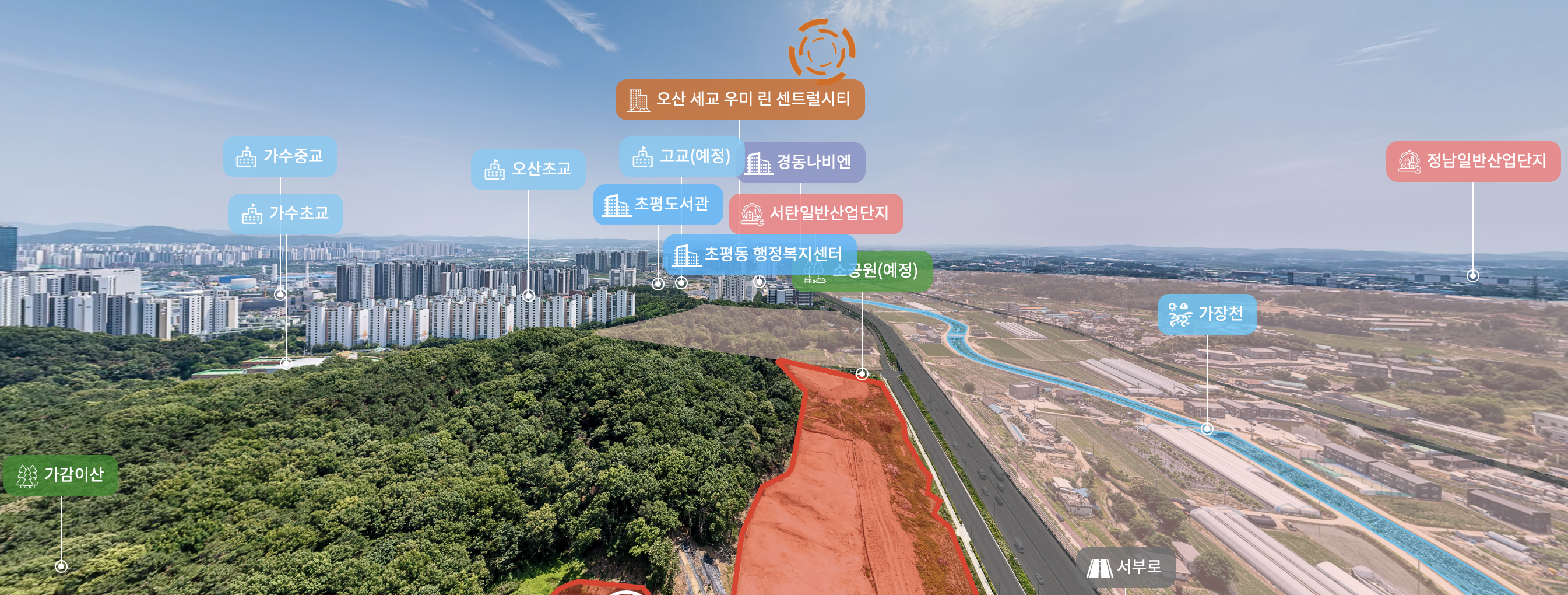 단지 반경 2km에는 롯데마트, 이마트, 오산장터, 오색시장 등 생활 기반 시설이 고르게 갖춰져 있습니다. 가수초 도보 통학이 가능하고 가수중, 오산중, 오산고, 오산정보고 등 주요 학군이 인접해 교육 환경 접근성도 뛰어납니다. 생활과 교육 모두를 충족하는 주거 환경입니다.