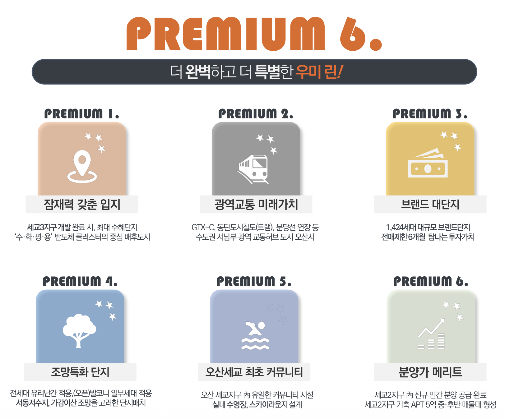 오산세교 우미린 레이크시티는 오산시 서동 50번지 일원에 자리한 중대형 중심 대단지로, 세교2·3지구 개발의 핵심 축에서 교통 접근성이 돋보이는 입지를 갖추고 있습니다. 오산세교 우미린 레이크시티는 2029년 7월 입주 예정이며 지하 3층부터 지상 29층까지 총 10개 동, 전용 84, 94, 101㎡ 구성의 1,424가구로 조성됩니다. 광역 교통망과의 연계성이 확장되면서 생활, 출퇴근, 도시 접근성 측면에서 미래가치가 더욱 높게 평가되고 있습니다.