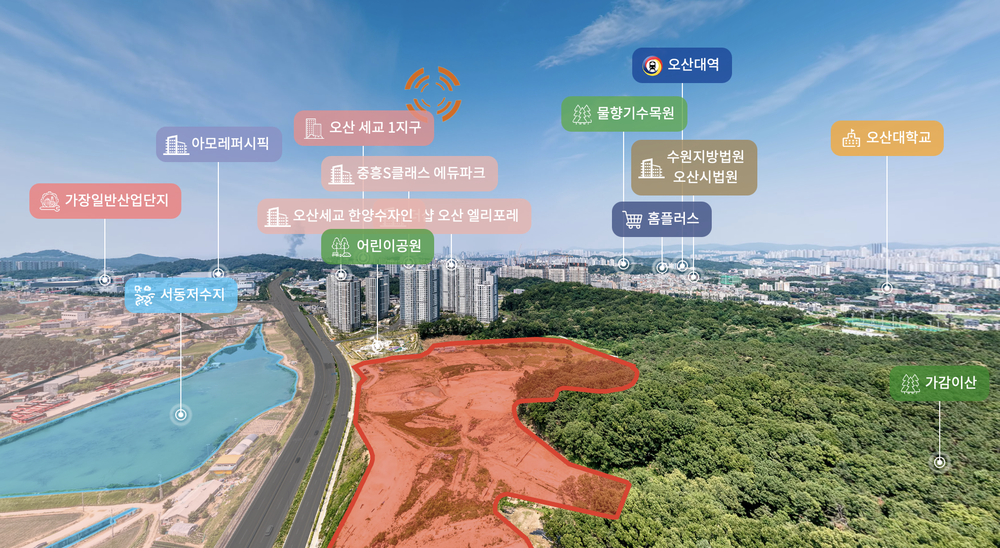 반경 2km 생활권에는 롯데마트, 이마트, 오색시장, 오산장터 등 편의시설이 고르게 분포하여 높은 생활 편의성을 제공합니다. 의료시설로는 조은오산병원이 인접해 안정적인 의료 접근성을 갖추고 있습니다. 교육환경은 가수초를 비롯해 가수중, 오산중, 오산고 등이 가까워 자녀 교육 여건까지 우수합니다.