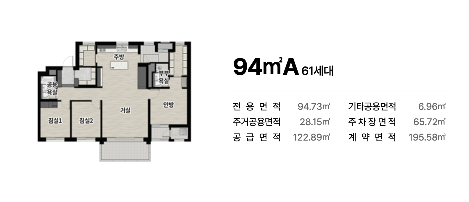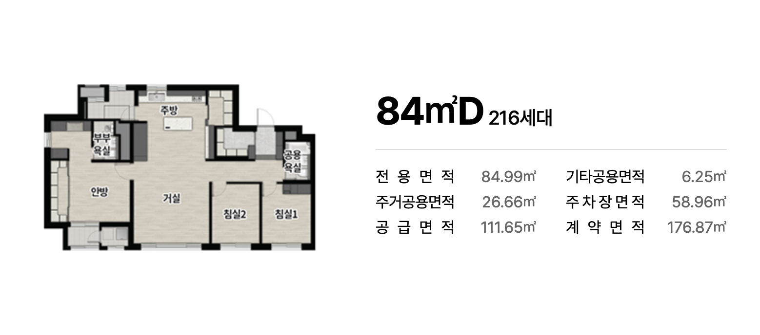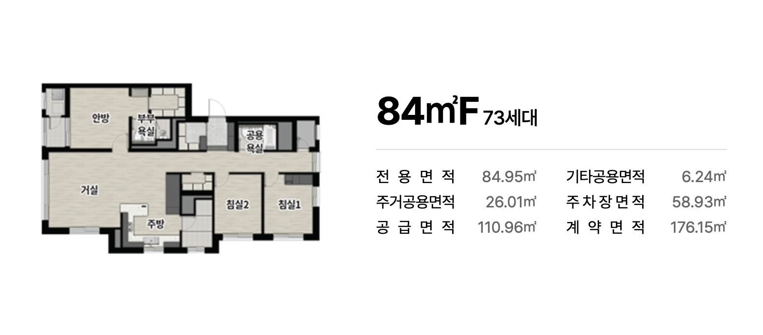전용 84㎡, 94㎡, 101㎡ 중심의 넓고 효율적인 구조가 적용되어 다양한 가족 구성에 적합한 실용적 평면을 제공합니다. 남향 위주 배치는 일조 확보에 유리하며 공간 활용도를 높인 설계가 돋보입니다. 수납 강화 구조와 여유 있는 거실 폭도 장점입니다.