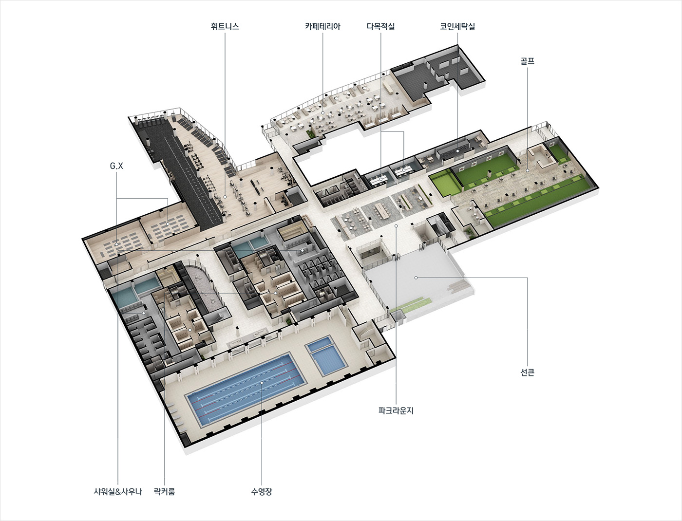 스포츠존에는 수영장, 휘트니스, 골프연습장, 실내체육관, 사우나 등이 준비됩니다. 또한 작은도서관, 프라이빗 독서실, 그룹스터디룸이 포함된 에듀존과 시니어라운지, 미디어실, 코인세탁실로 구성된 컬처존이 조성됩니다.