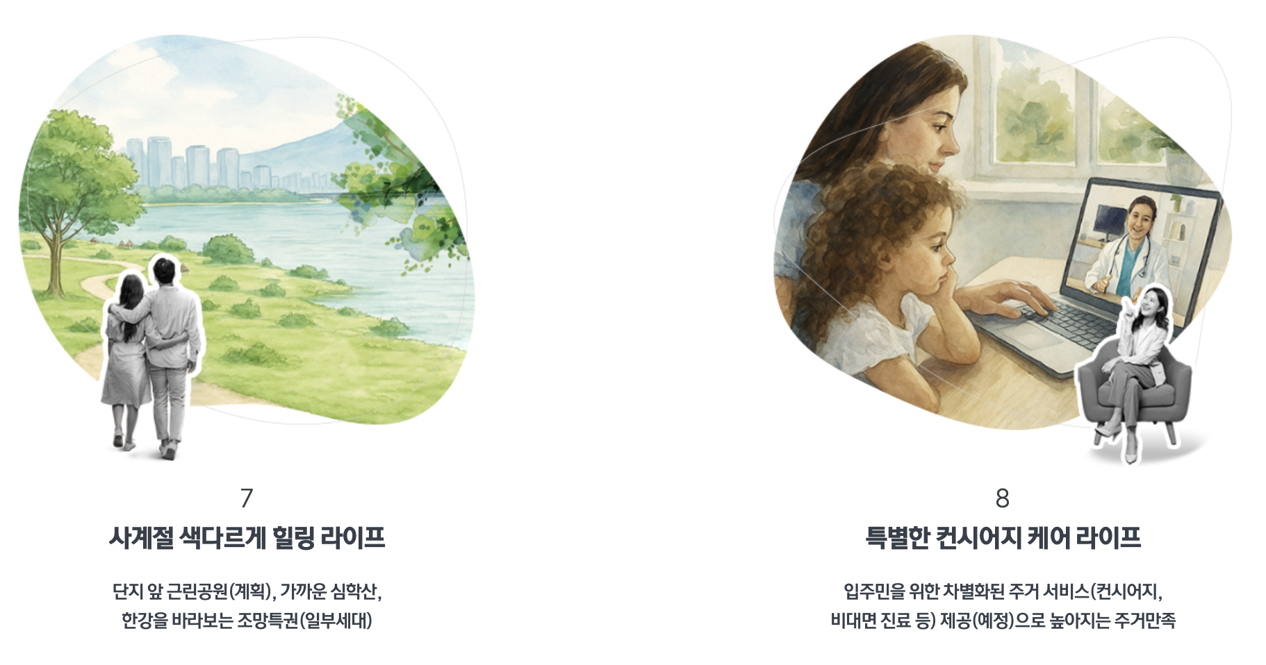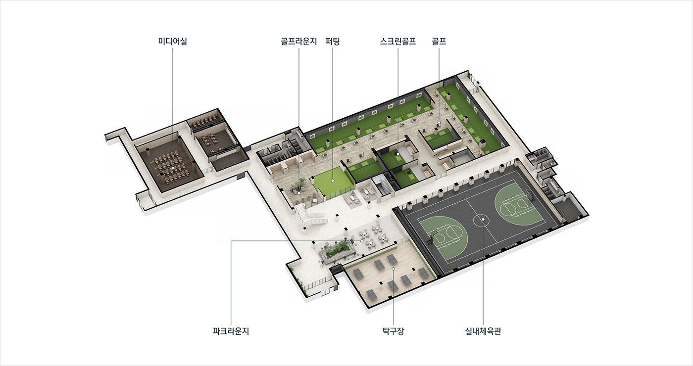 수영장과 실내체육관, 골프연습장, 사우나 등 다양한 운동 기반 시설이 단지 내부에 마련됩니다. 작은도서관과 독서실, 그룹스터디룸이 구성된 에듀존과 시니어라운지, 미디어실 등이 포함된 컬처존도 갖추어졌습니다. 세대별 라이프스타일을 반영한 입체적 커뮤니티 구성이 돋보입니다.