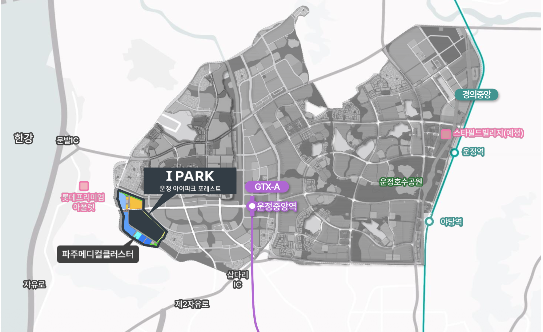 GTX A 운정중앙역을 이용하면 서울역과 삼성역(예정)까지 20분대 이동이 가능해 광역 접근성이 뛰어납니다. 자유로 진입이 편리하며 수도권제2순환고속도로와 평택파주고속도로(예정)까지 더해져 다양한 방향으로 이동 효율이 높습니다. 교통망 확장과 개발호재가 결합돼 장기적 가치 상승 기대가 큽니다.
