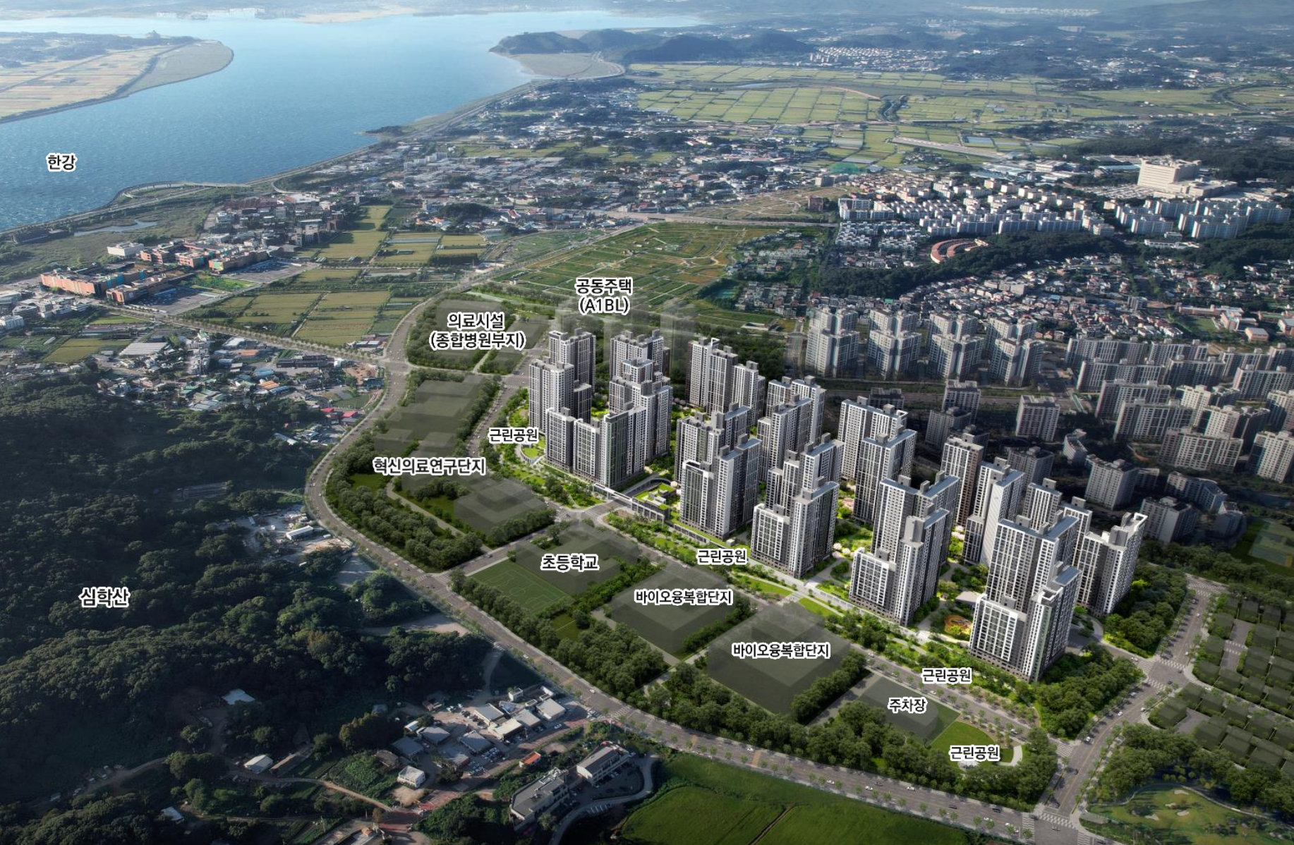 심학산과 초롱꽃공원이 가깝고 일부 세대에서는 한강 조망까지 확보할 수 있습니다. 단지 내부는 시그니처필드, 네이처필드, 커뮤니티필드 등 테마형 조경이 배치돼 외부 자연과 내부 조경이 자연스럽게 이어지는 구조입니다. 자연 친화 요소가 쾌적한 주거환경을 강화합니다.