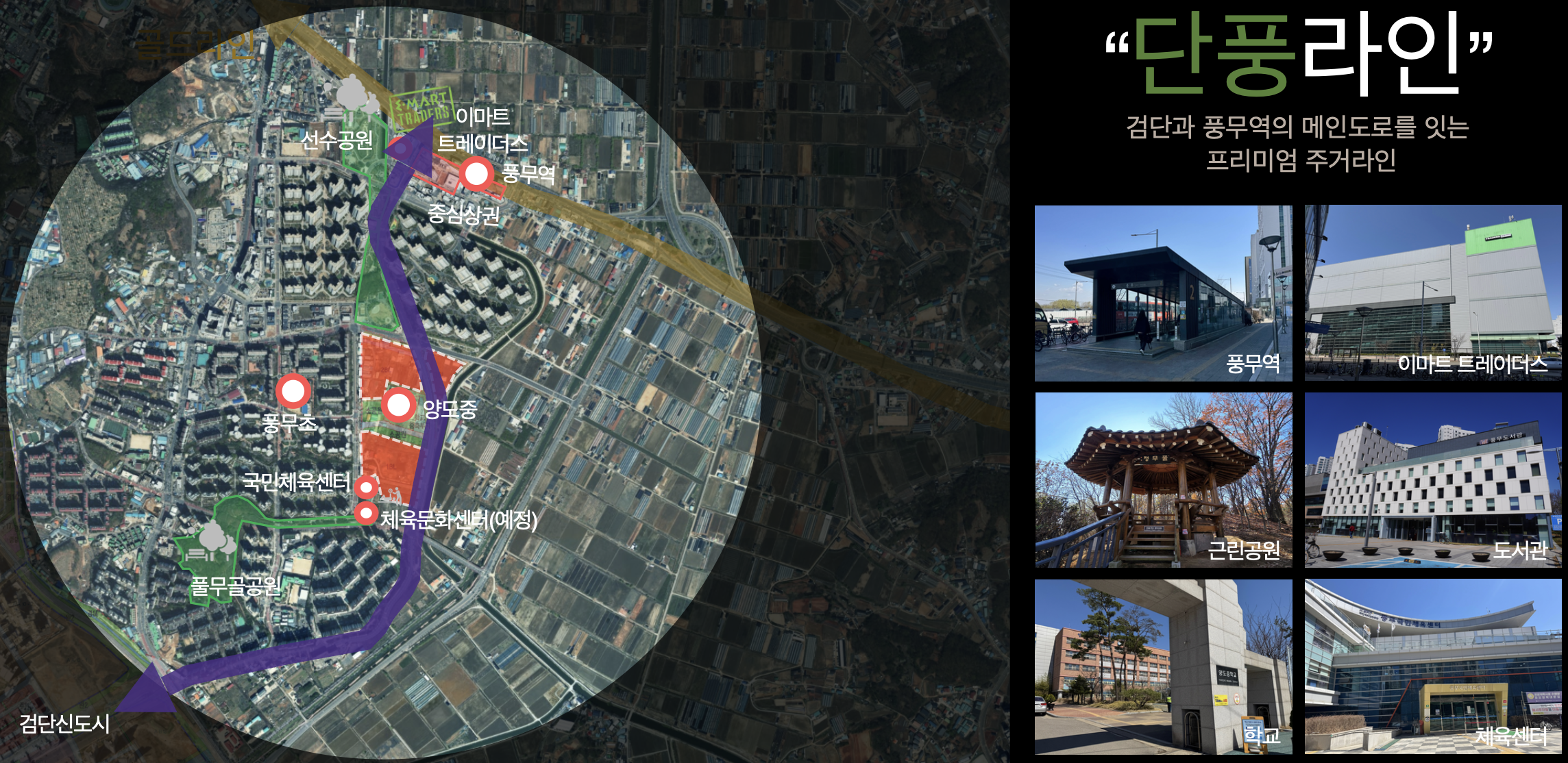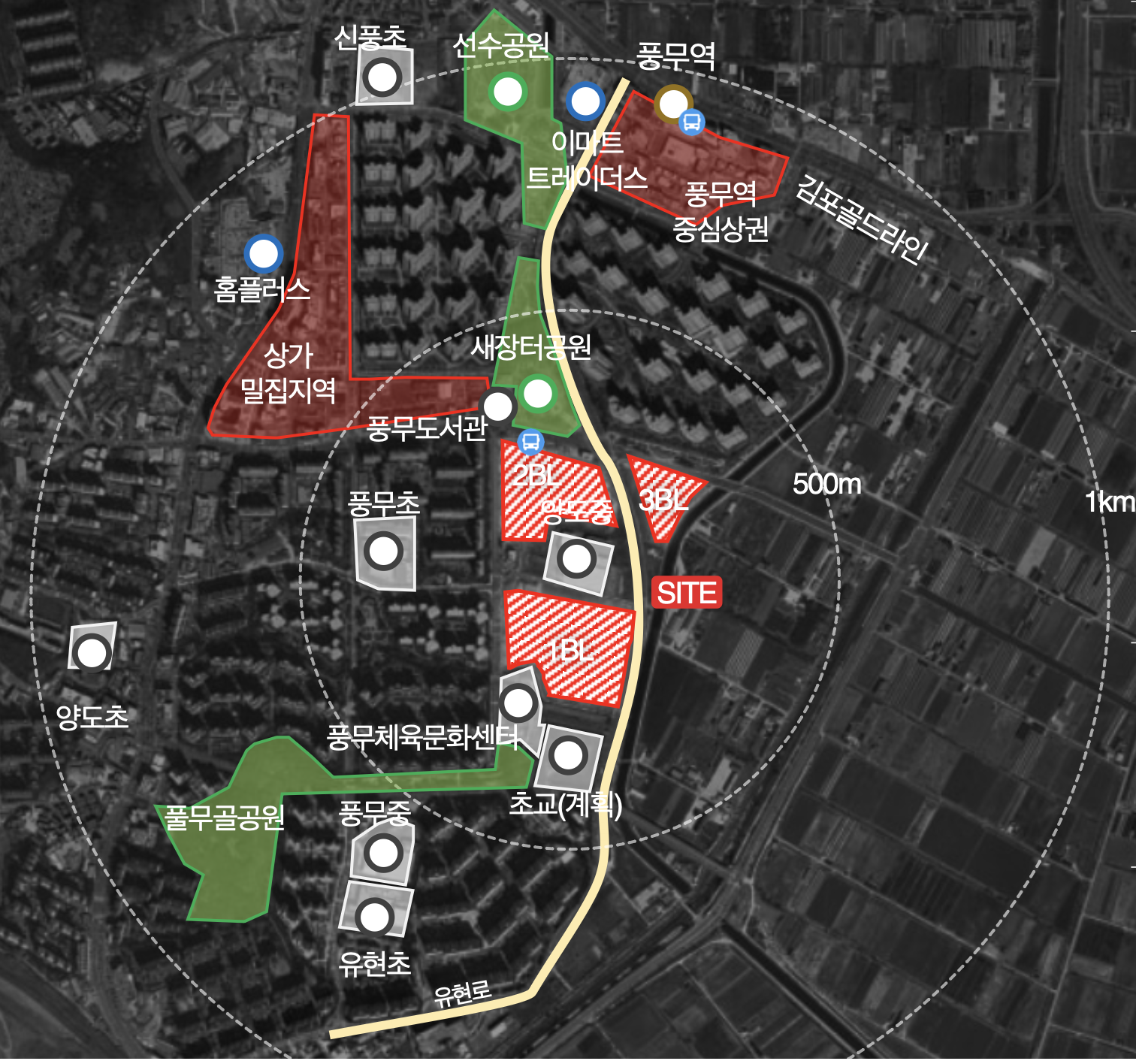풍무초, 유현초, 신풍초, 양도초 등 초등학교가 단지 인근에 밀집해 도보 통학이 가능한 학부모 선호형 입지를 갖추고 있습니다. 양도중과 풍무중도 가까워 중학교 접근성도 안정적입니다. 이마트 트레이더스와 홈플러스, 풍무역 상업지구까지 인접해 생활 편의 시설 이용도 매우 편리합니다.