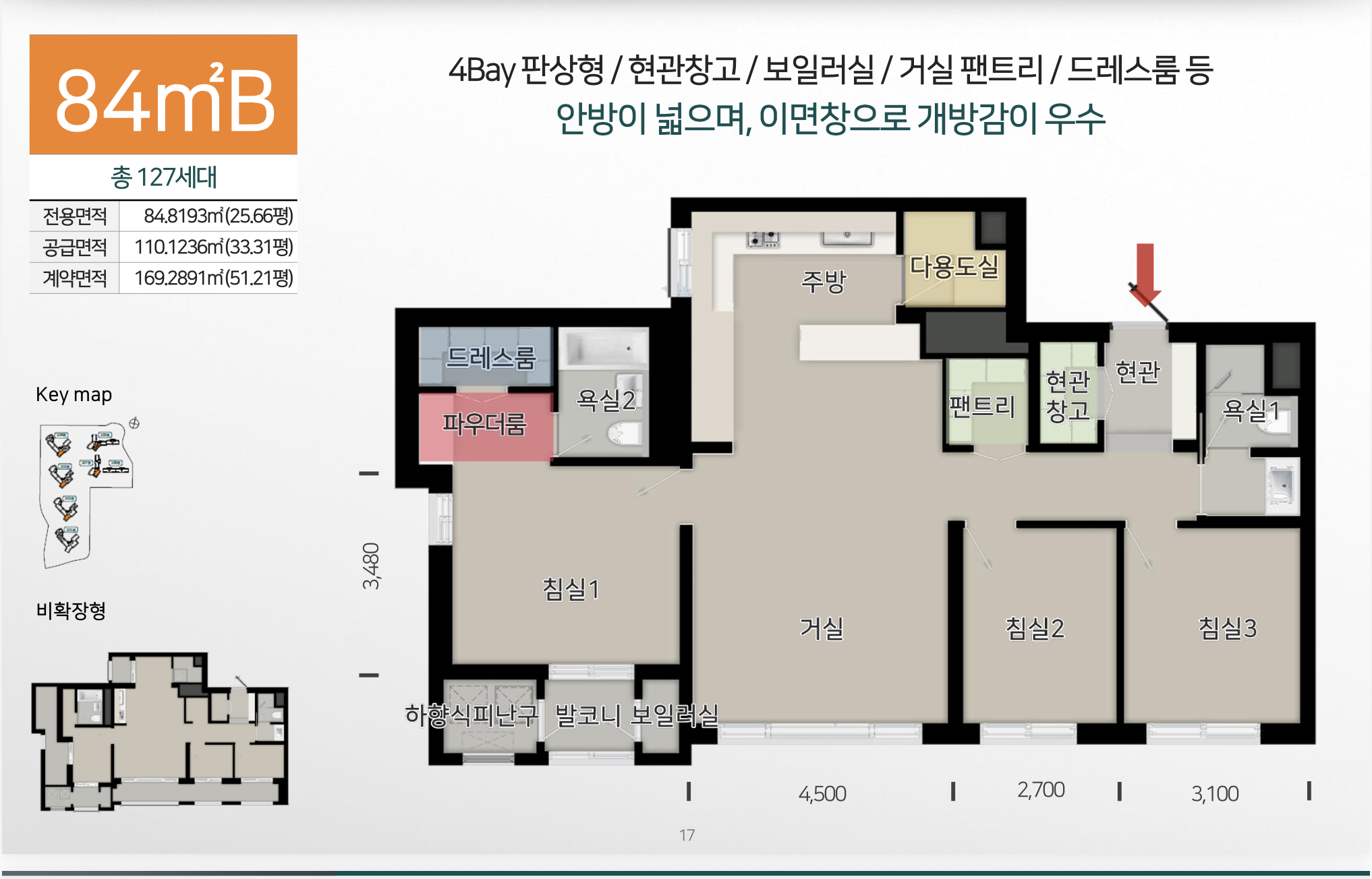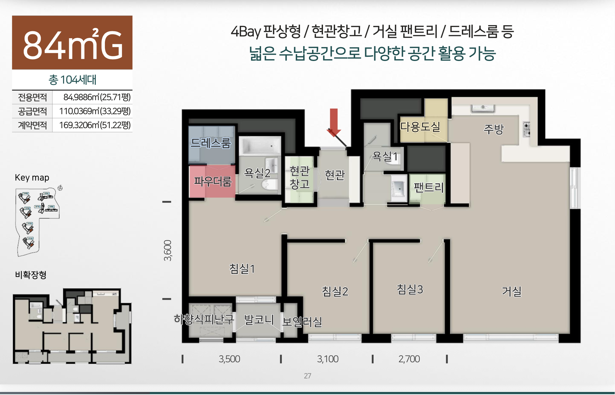 전 세대에 드레스룸과 다용도실이 기본 제공돼 수납 활용도가 높습니다. 전용 84㎡ 타입에는 현관창고와 팬트리가 적용돼 계절용품과 대형 수납이 용이합니다.