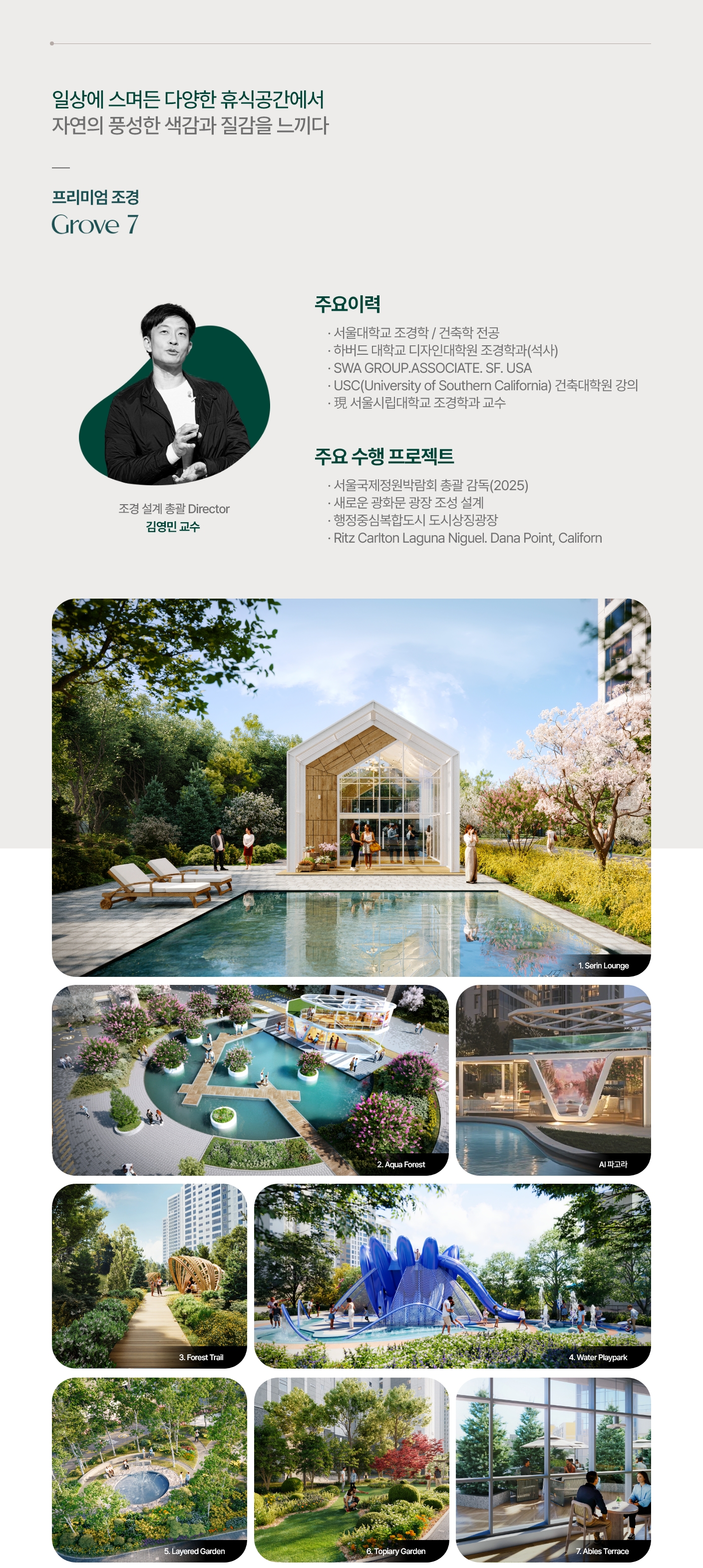 아쿠아 포레스트, 워터 플레이파크, 패밀리 가든, 힐링 가든 등 7개 테마 조경이 단지 곳곳에 조성됩니다. 지상에 차량 통행이 없는 구조로 계획돼 쾌적한 보행 환경이 유지됩니다.