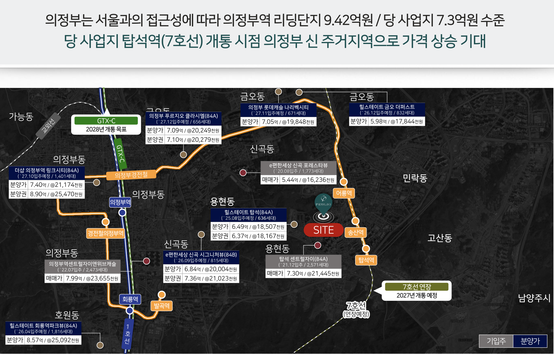 의정부 경전철 송산역을 도보로 이용할 수 있어 의정부역과 주요 생활권 이동이 수월합니다. 수도권 지하철 7호선 연장으로 추진 중인 탑석역과의 연계로 서울 동북권 접근성 변화에 대한 기대감도 이어지고 있습니다.
