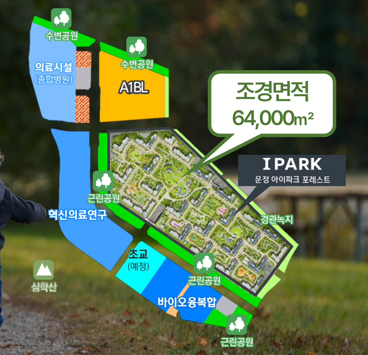 심학산과 초롱꽃공원이 인접해 녹지 접근성이 뛰어납니다. 운정호수공원과 한울공원, 심학산 둘레길을 이용할 수 있어 쾌적한 주거 환경을 유지할 수 있습니다.