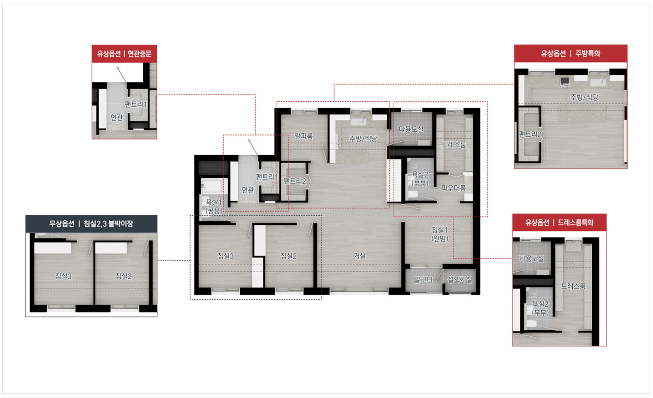 침실 붙박이장형과 수납 강화형, 드레스룸 특화, 주방 특화 설계 등 유상 옵션 선택이 가능합니다. 월패드와 스마트스위치를 활용한 홈 네트워크 시스템과 안면인식 스마트 원 패스 시스템을 적용해 주거 편의성과 보안성을 높였습니다.