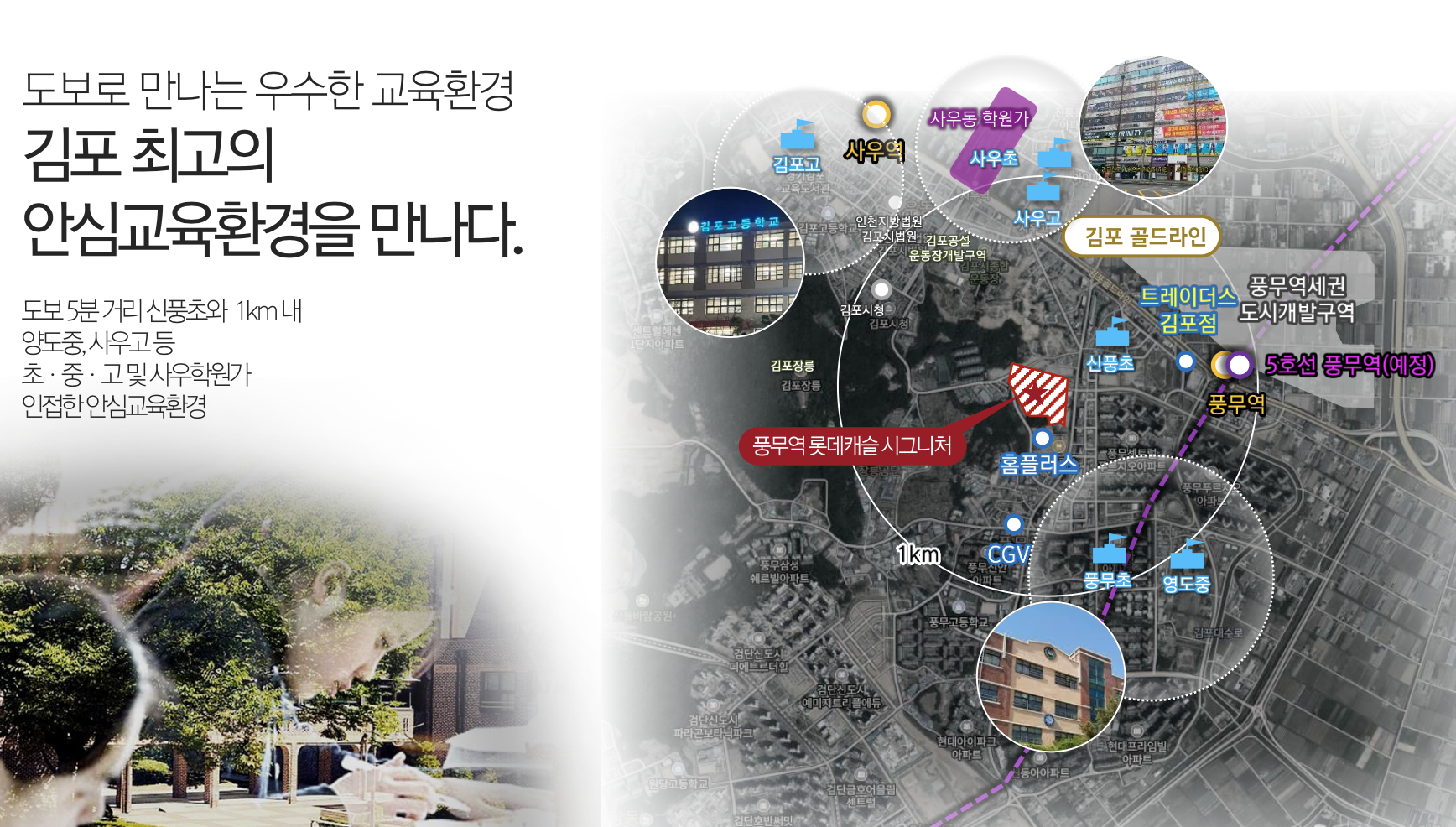 이마트 트레이더스, 롯데마트, 홈플러스 등 대형 유통시설과 김포시청, 김포시민회관 이용이 편리합니다. 신풍초등학교, 사우중학교, 풍무고등학교가 인접해 있으며 사우동 학원가 이용도 수월합니다.