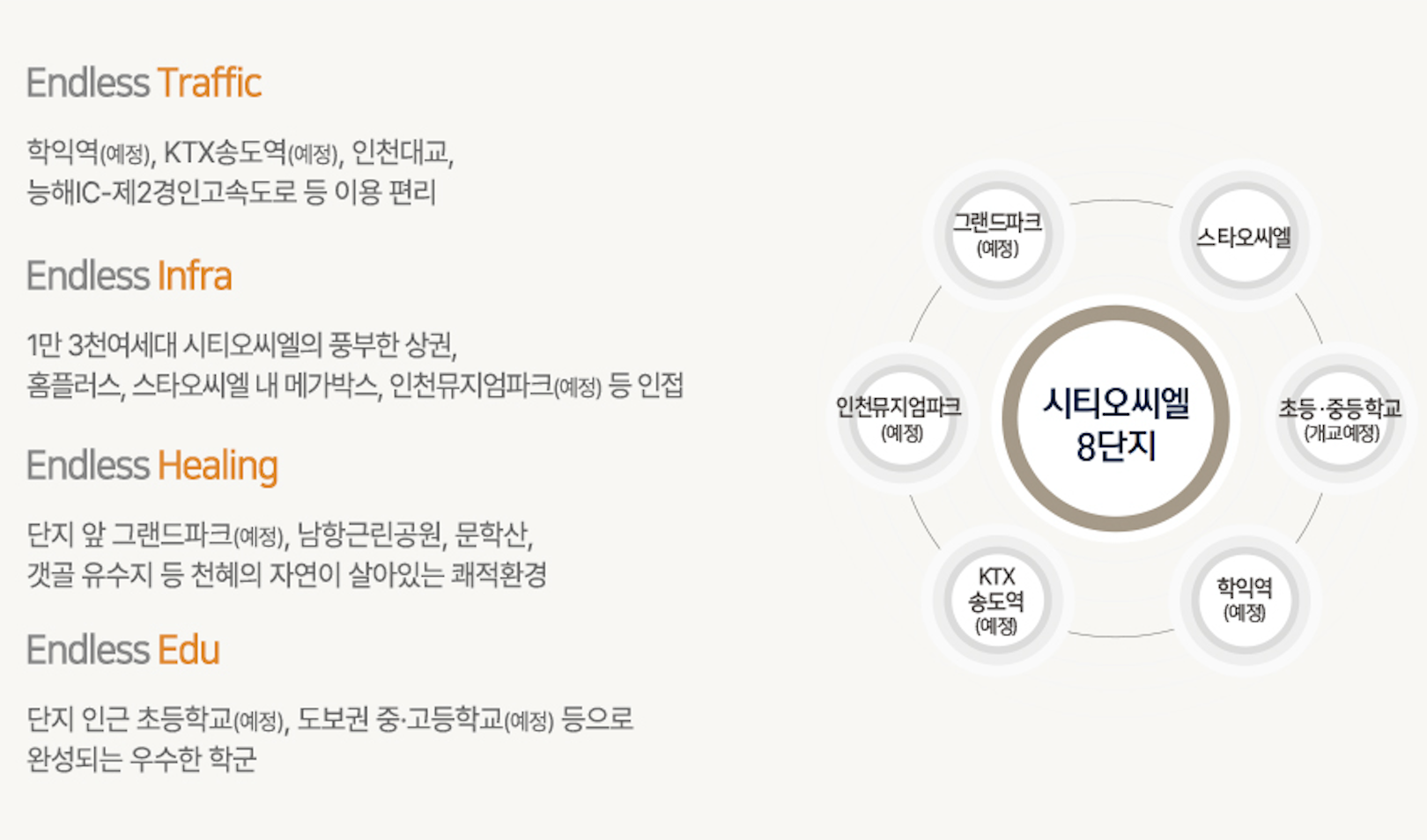 스타오씨엘 상업 문화 업무 시설이 가까워 영화관과 쇼핑시설, 다양한 문화 공간을 편리하게 이용할 수 있습니다. 초등학교와 중학교, 고등학교 예정 부지가 인접해 통학 환경이 안정적이며 홈플러스와 메가박스, 인천뮤지엄파크 예정지까지 가깝게 이용할 수 있습니다.