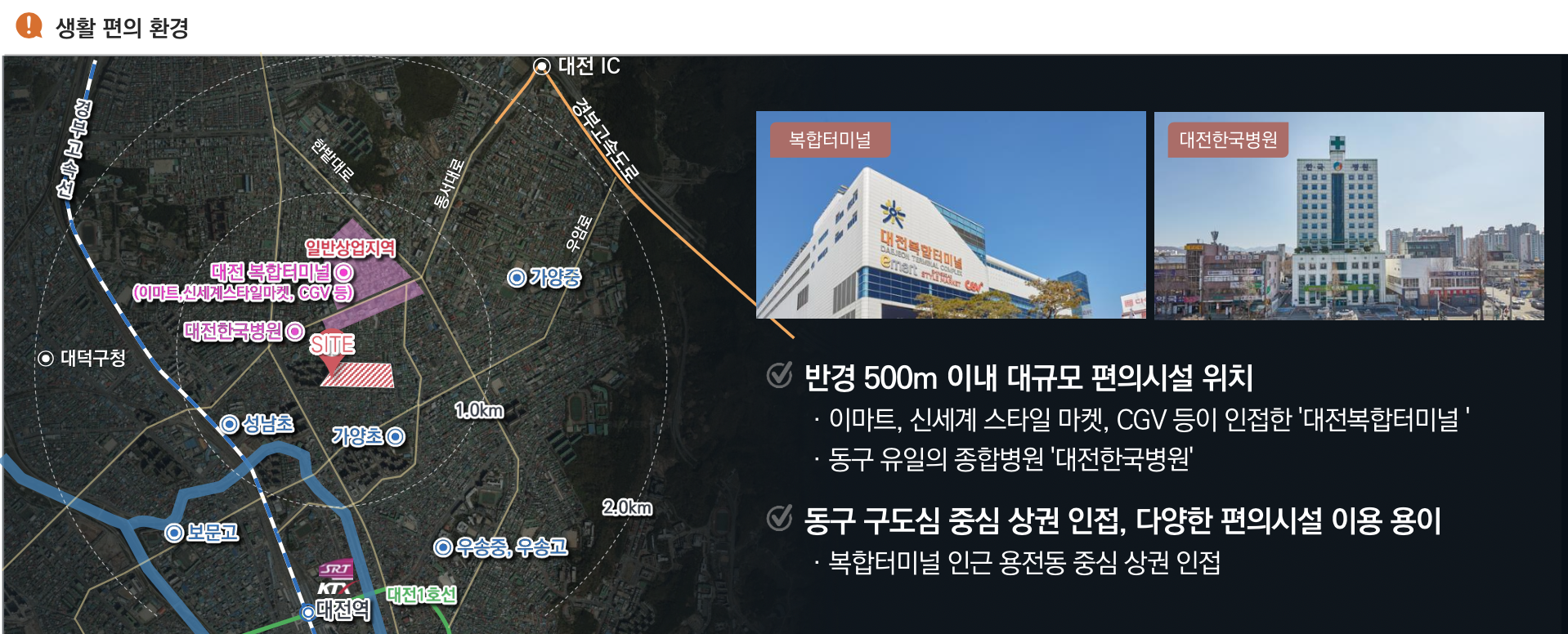 대전한국병원과 이마트 대전터미널점, CGV 대전터미널점, 영풍문고 대전점이 가까워 생활 편의성이 뛰어납니다. 가양초등학교와 성남초등학교를 비롯해 가양중학교, 우성중학교, 우성고등학교, 보문고등학교가 인접해 교육 환경이 안정적입니다.