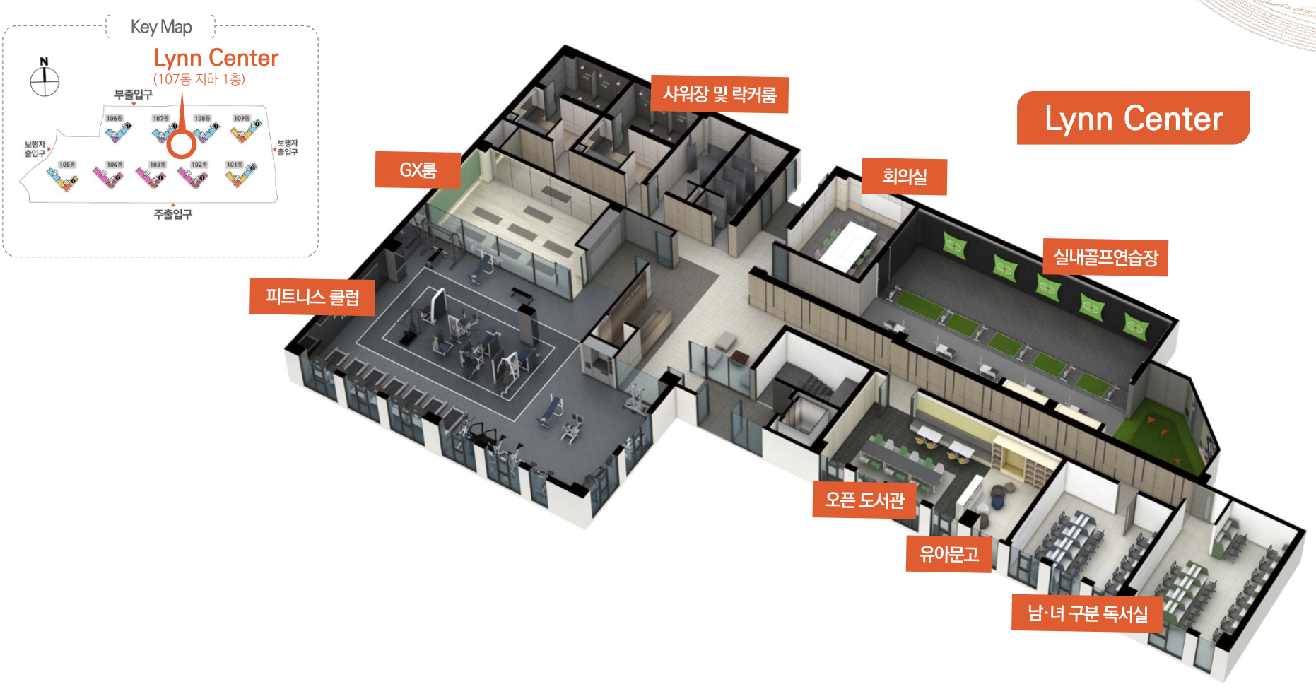 피트니스센터와 실내 골프연습장, GX룸이 마련됩니다. 맘스스테이션과 남녀 독서실, 유아문고, Lynn 카페와 도서관이 함께 구성되어 단지 내 여가생활과 취미활동이 가능합니다.