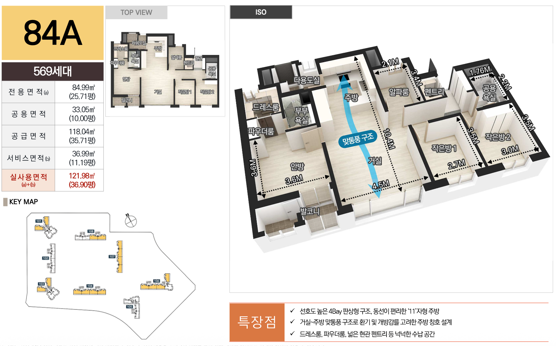 전용 59㎡와 84㎡는 남향 위주 배치로 채광과 통풍을 고려해 설계되었습니다. 공간 활용도를 높인 평면 구성과 수납 특화 설계가 적용됩니다.