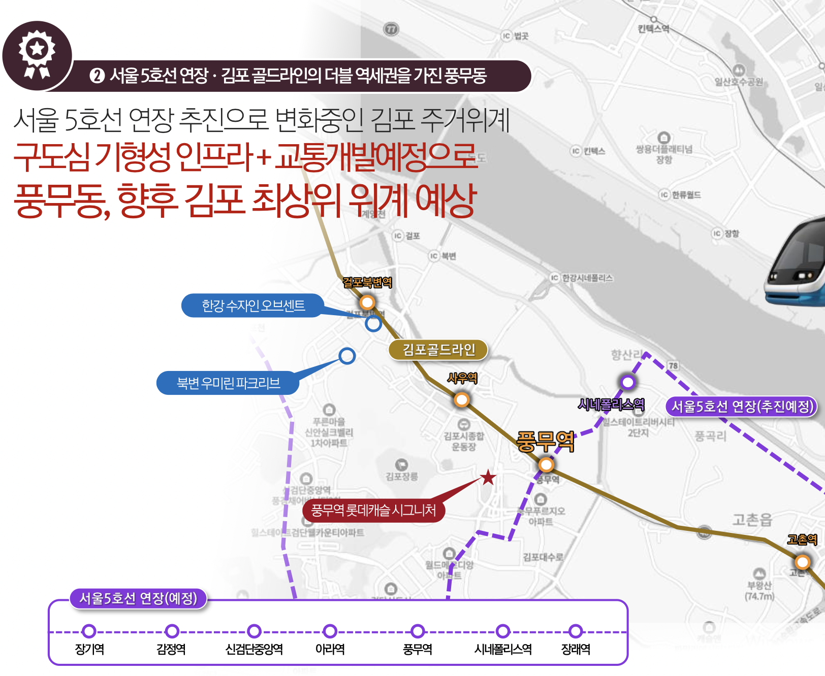 도보거리에 위치한 김포골드라인 풍무역을 편리하게 이용할 수 있고 48번국도, 김포한강로, 올림픽대로, 인천국제공항고속도로, 수도권제1순환고속도로, 원당-테리간광역도로(예정), 도계-마전간도로(예정), 지하철5호선 연장(추진예정) 등을 통해 서울 및 수도권 주요도심 진출입이 수월합니다.