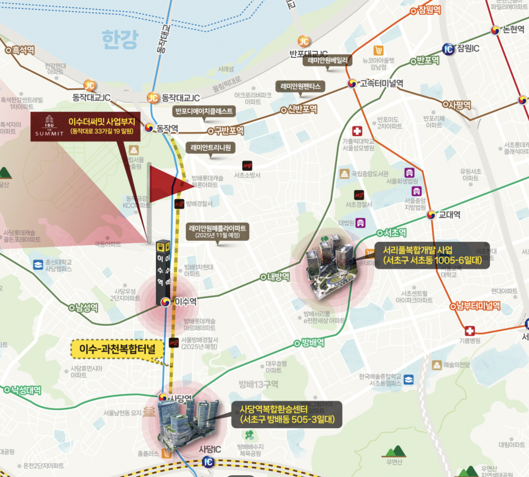 단지에서 도보 5분 내 접근 가능한 이수역은 지하철 4호선과 7호선이 만나는 환승역으로 여의도, 강남, 종로 등 주요 업무지구 이동이 편리합니다. 사당대로, 동작대로, 남부순환로를 이용하면 방배동, 사당사거리, 관악구 방면 이동도 수월하게 이어집니다.