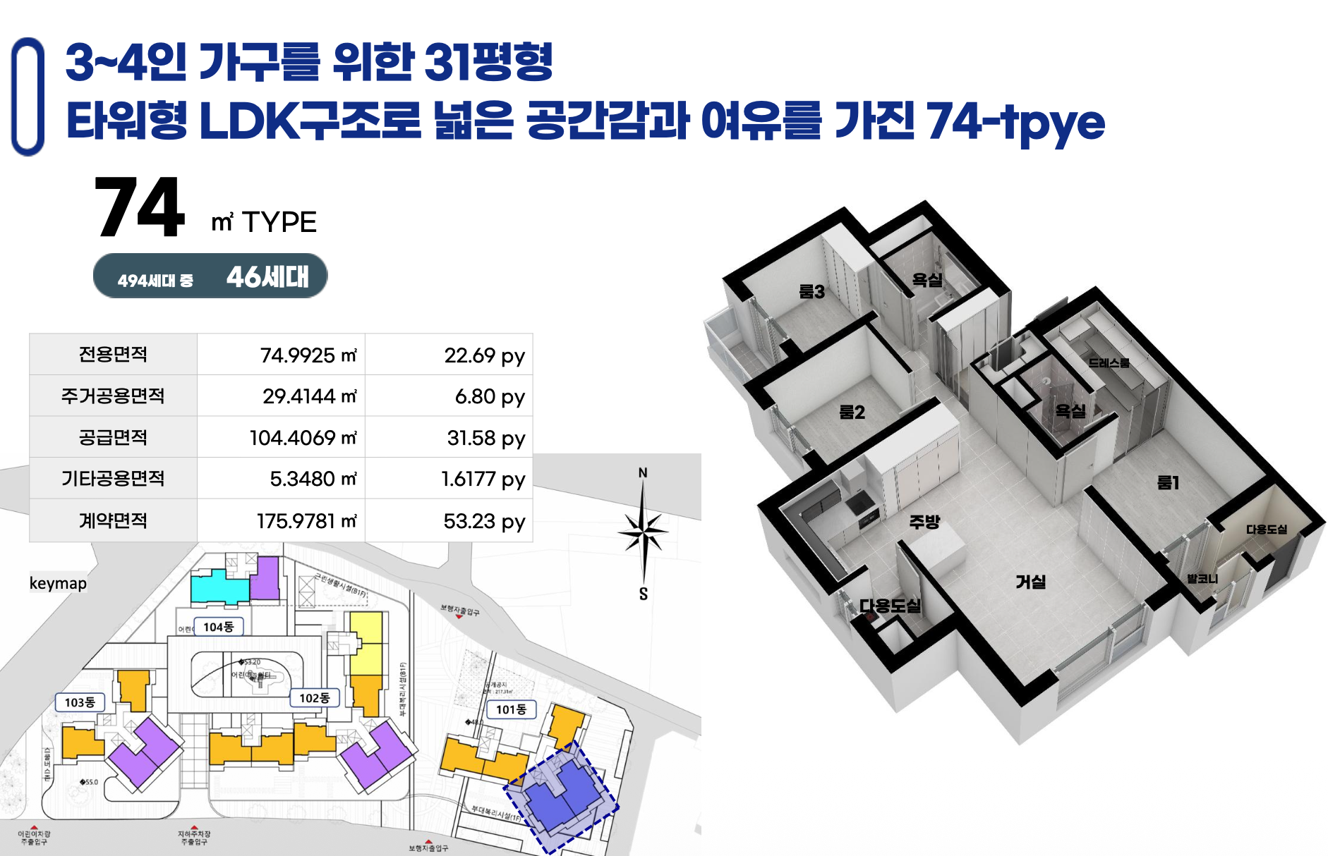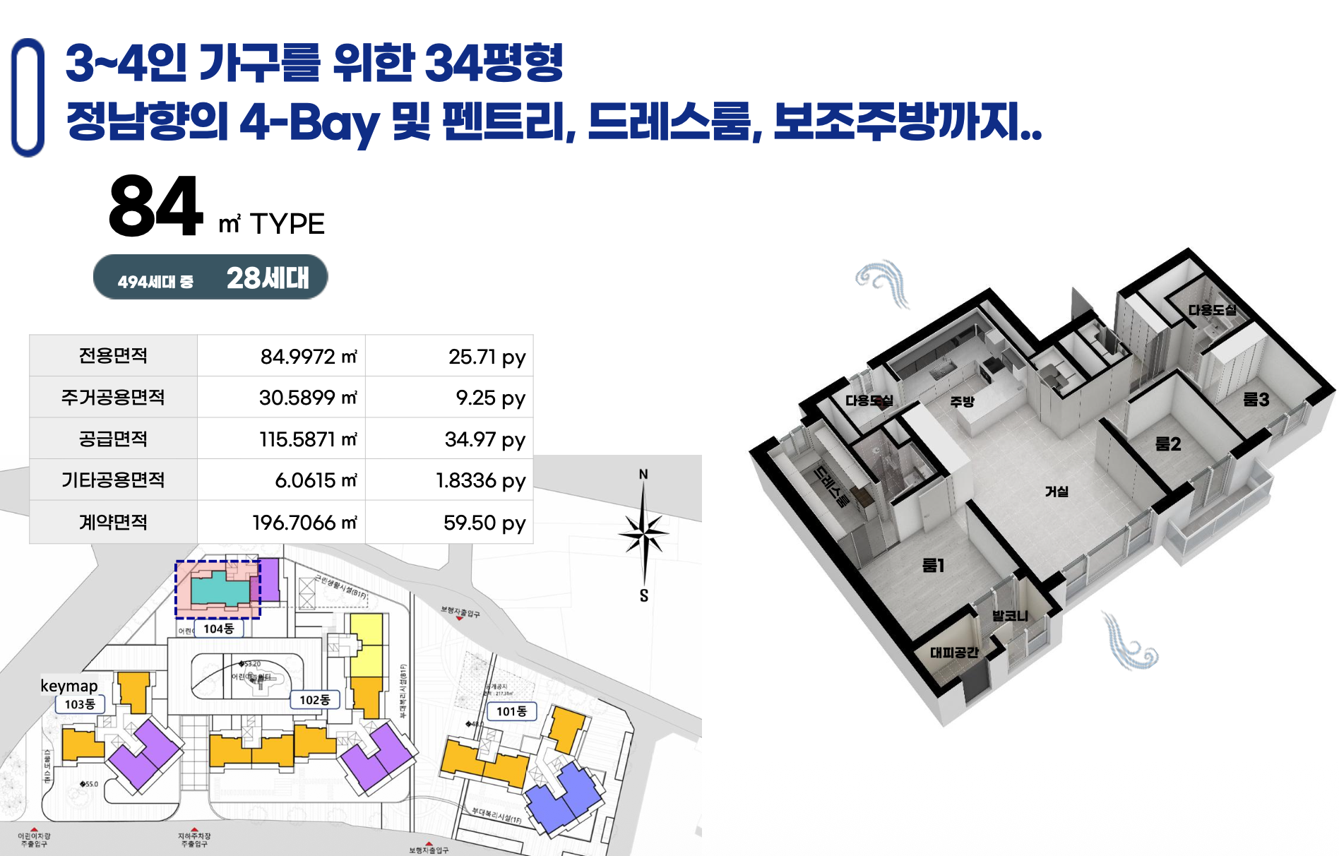 남향 위주의 단지 배치로 채광과 통풍을 확보했으며, 타워형 구조를 적용한 LDK 설계로 실내 개방감을 강조했습니다. 4베이 특화 평면을 통해 거실과 주방의 공간 활용성을 높이고 수납 구성도 함께 강화했습니다.