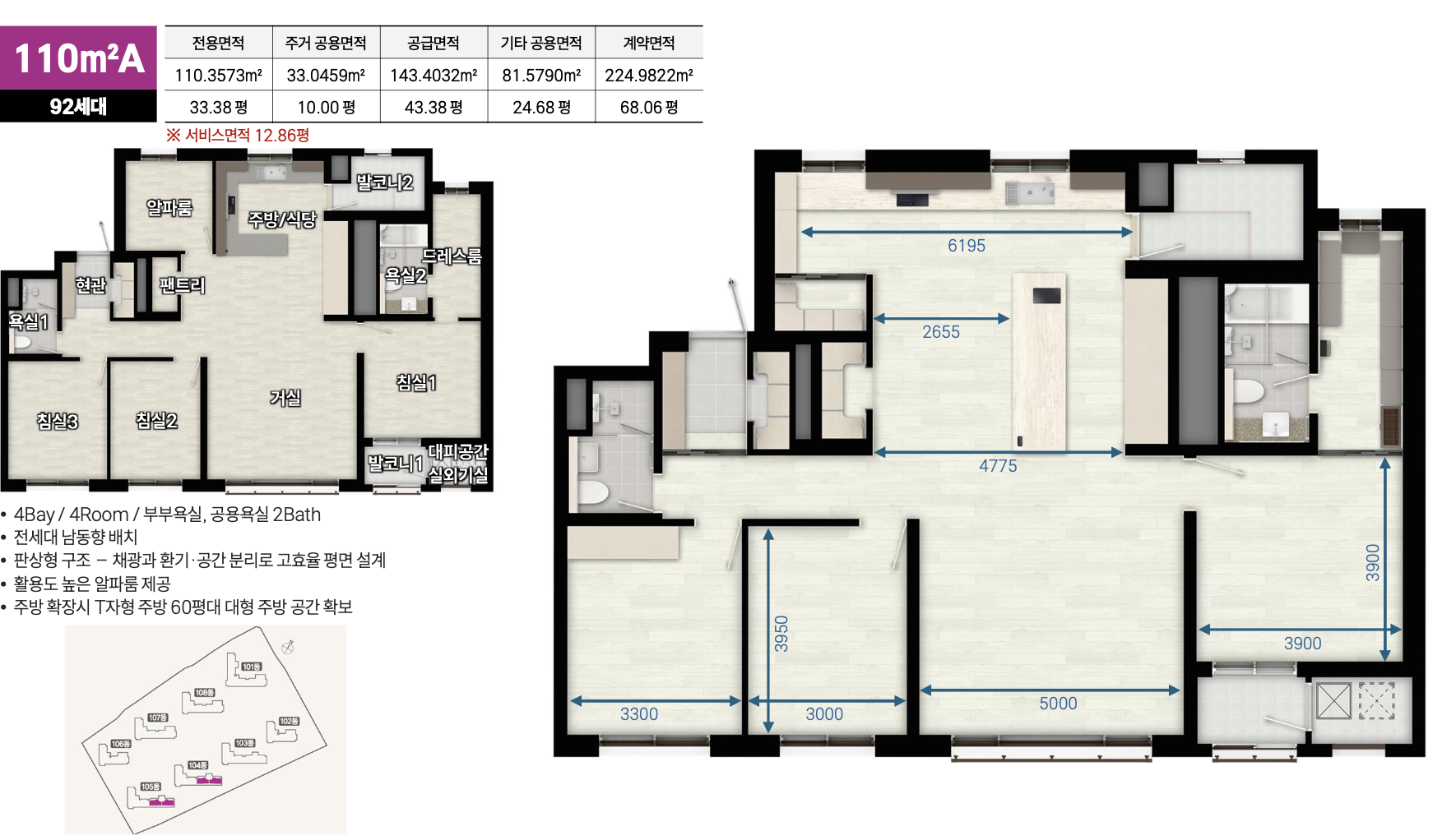 남향 위주 동 배치와 최대 119m 확보된 동간 간격으로 개방감이 뛰어나며 세대 간 간섭을 줄였습니다. 4베이 구조를 적용하고 타입별 알파룸과 팬트리, 넓은 드레스룸을 구성해 실내 활용도를 높였습니다.