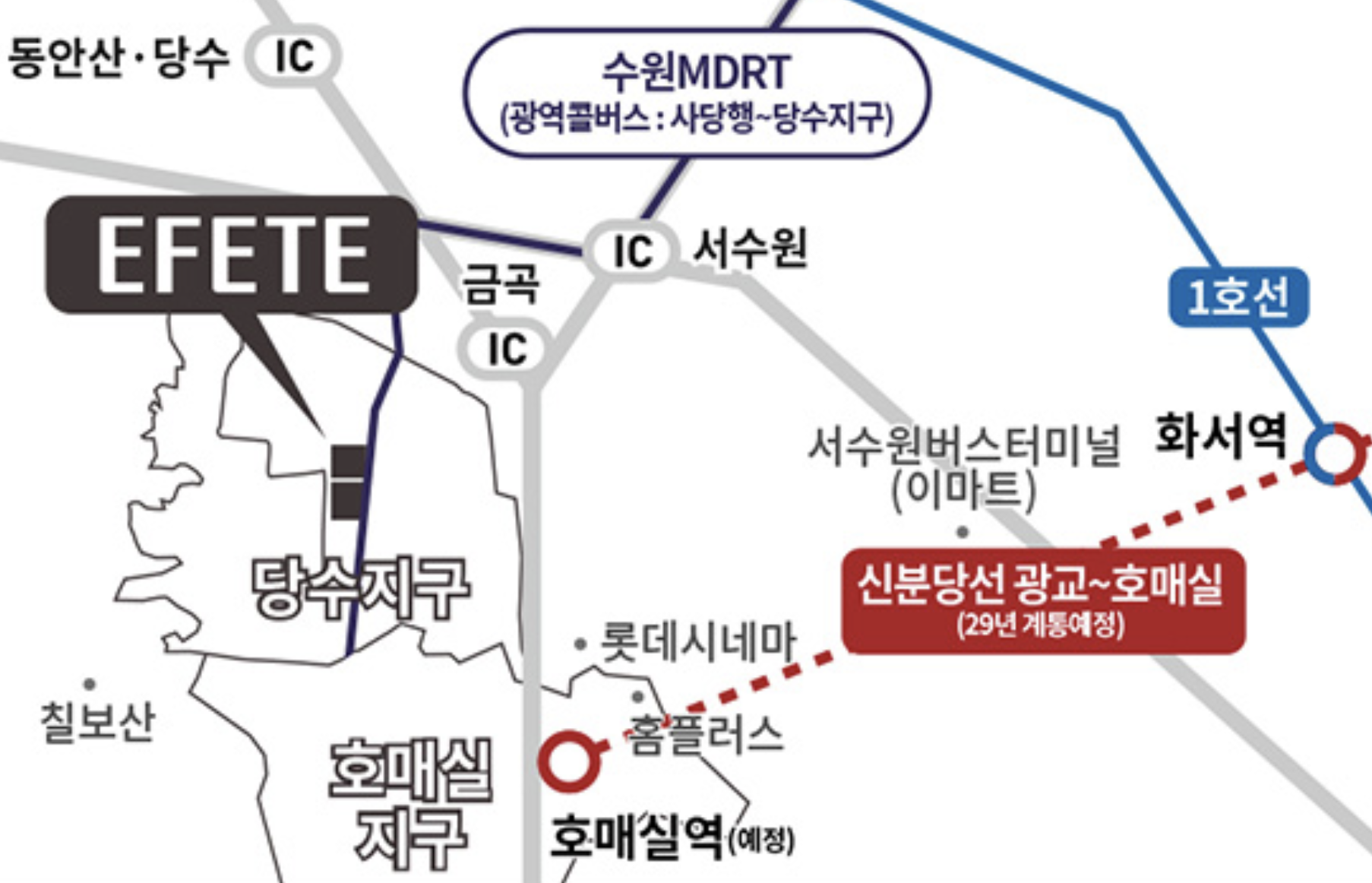 신분당선 호매실역(2029년 개통예정)을 편리하게 이용할 수 있고 수원 MDRT, 평택파주고속도로, 과천봉담고속화도로, 서해안고속도로, 수원광명고속도로, 봉담-동탄고속도로, 영동고속도로, 용인-서울고속도로로 서울 및 주요도심으로 빠르게 이동할 수 있습니다.
