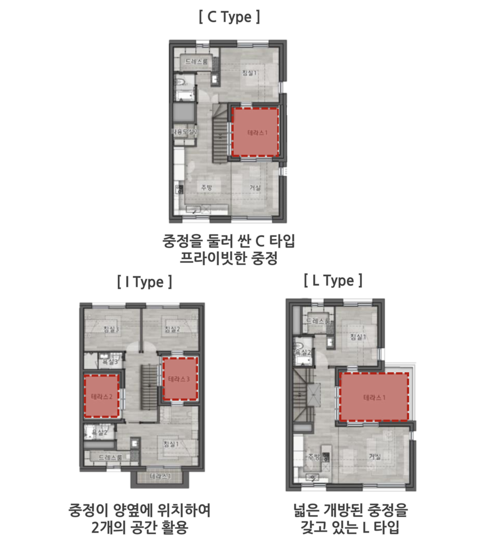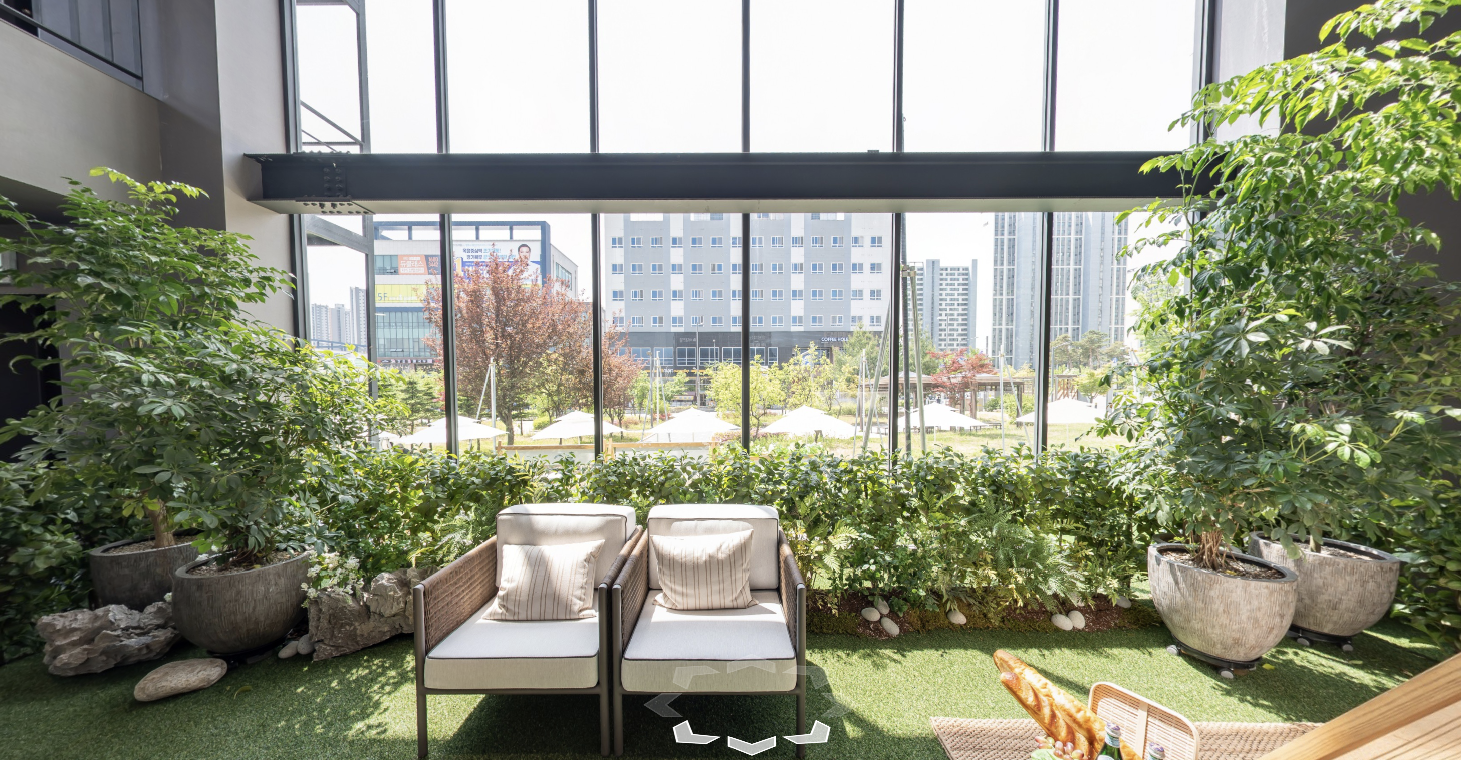 넓은 서비스 면적으로 라이프스타일에 따라 공간활용이 가능합니다. 외부 전경을 감상할 수 있는 중정과 테라스, 다락, 세대정원 등의 특화 공간도 함께 조성돼 일반 아파트보다 넓은 면적을 실사용 공간으로 이용할 수 있습니다.