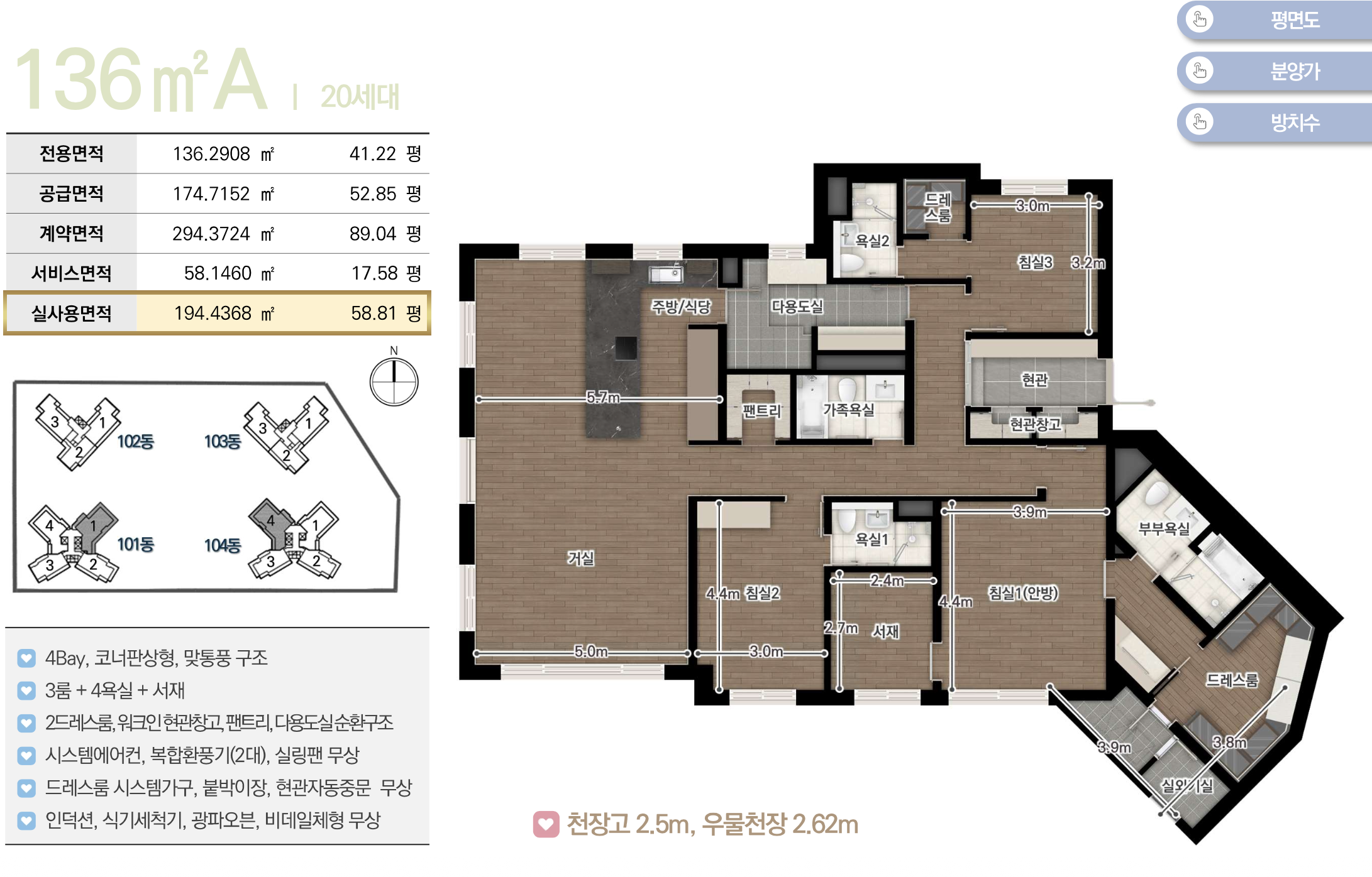 채광 및 개방감 등이 우수한 남향위주의 단지로 배치하였고 차별화된 4-5베이 판상형 구조로 주거만족도를 높였습니다. 또한 팬트리, 드레스룸, 알파룸 등 수납특화 평면으로 공간활용도를 극대화하였습니다.