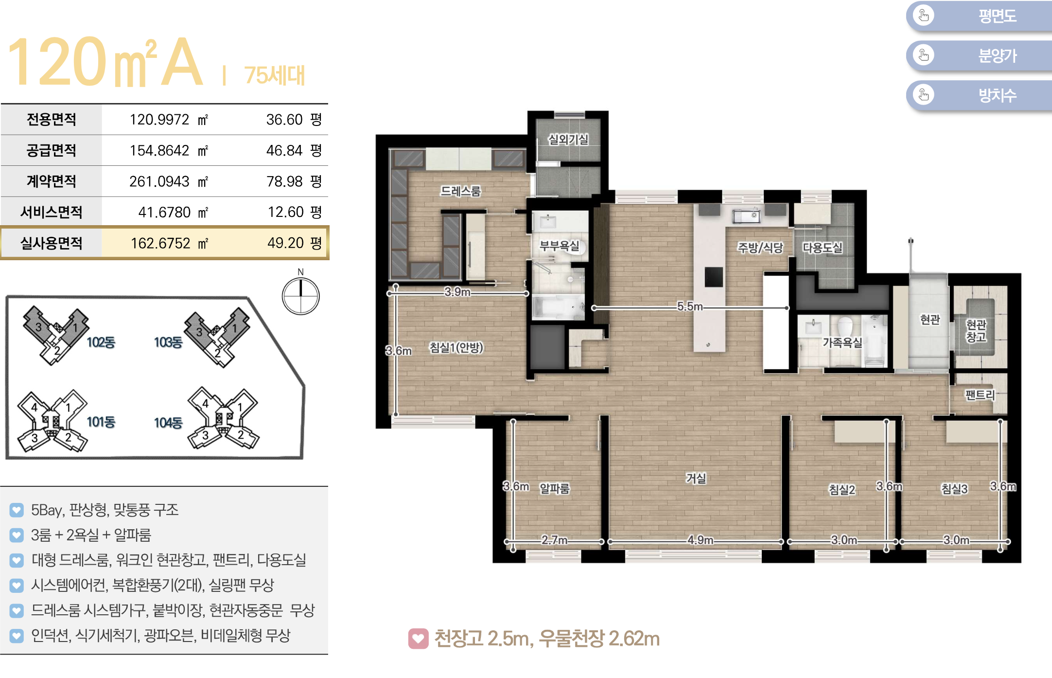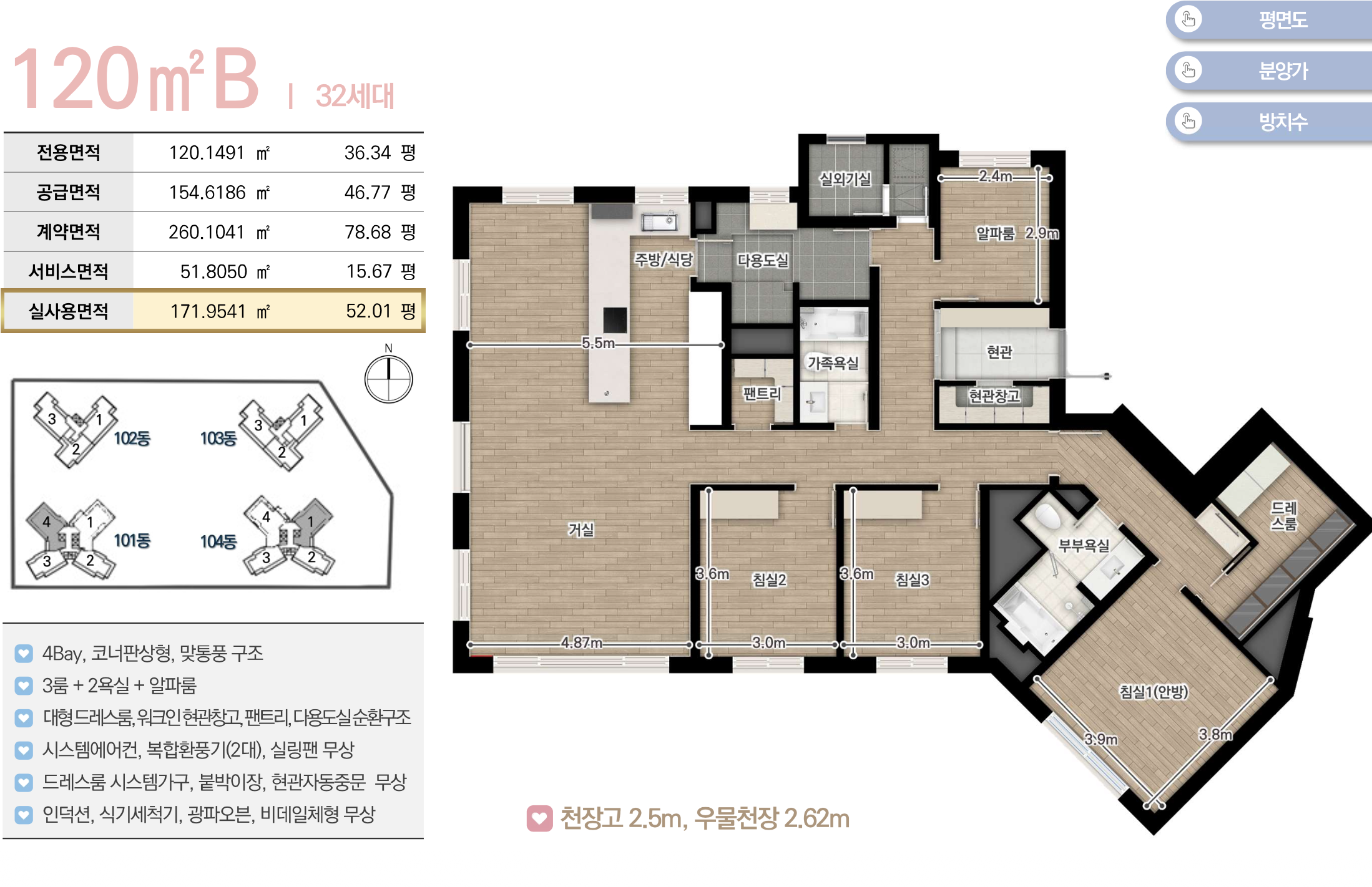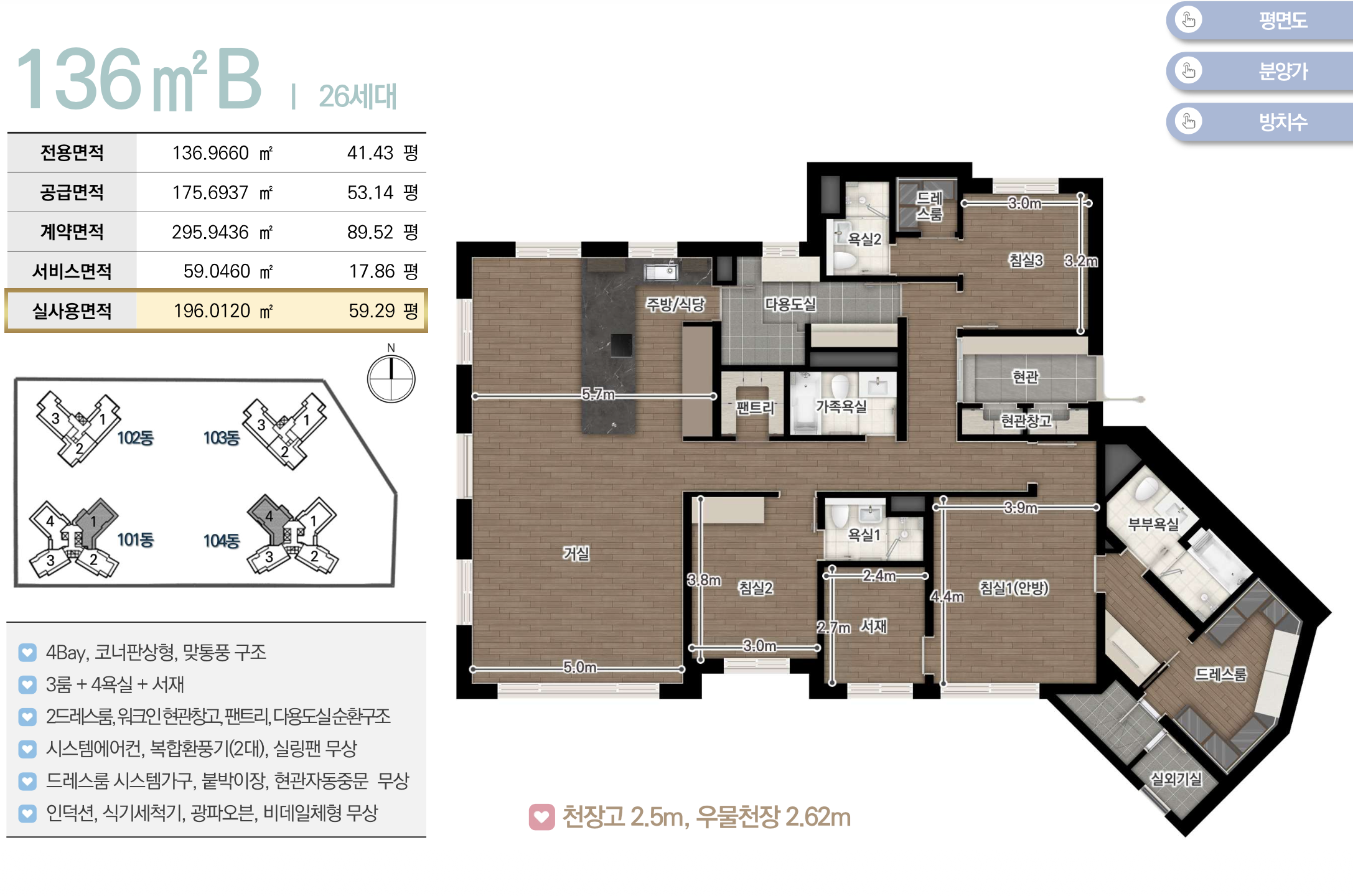채광 및 개방감 등이 우수한 남향위주의 단지로 배치하였고 차별화된 4-5베이 판상형 구조로 주거만족도를 높였습니다. 또한 팬트리, 드레스룸, 알파룸 등 수납특화 평면으로 공간활용도를 극대화하였습니다.