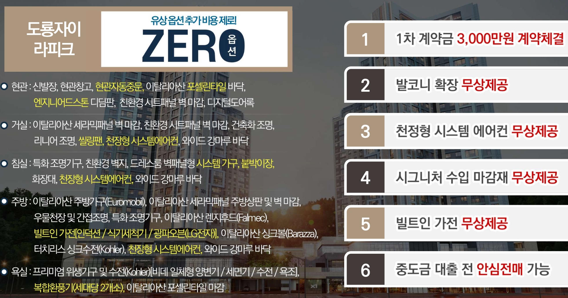 도룡자이 라피크 모델하우스에서는 120㎡ 20억원대, 136㎡ 23억원대 분양가와 1차 계약금 3000만원, 발코니확장 무상 혜택을 적용해 내집마련의 기회를 제공하고 있습니다. 도룡자이 라피크 모델하우스에 문의주시면 자세한 안내를 도와드리겠습니다.